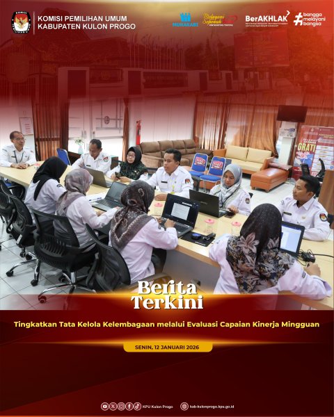 Wates — Komisi Pemilihan Umum (KPU) Kabupaten Kulon Progo kembali melaksanakan Rapat Evaluasi Capaian Kinerja Mingguan pada Senin (12/1/2026) bertempat di Ruang Pendopo KPU Kabupaten Kulon Progo. Kegiatan rutin ini diikuti oleh Sekretaris, seluruh Kasubbag, Pejabat Pengadaan, Pengelola Keuangan, serta staf Subbagian Rendatin di lingkungan KPU Kabupaten Kulon Progo. Pada kesempatan kali ini, rapat dipimpin Sekretaris KPU Kabupaten Kulon Progo, Widi Purnama.