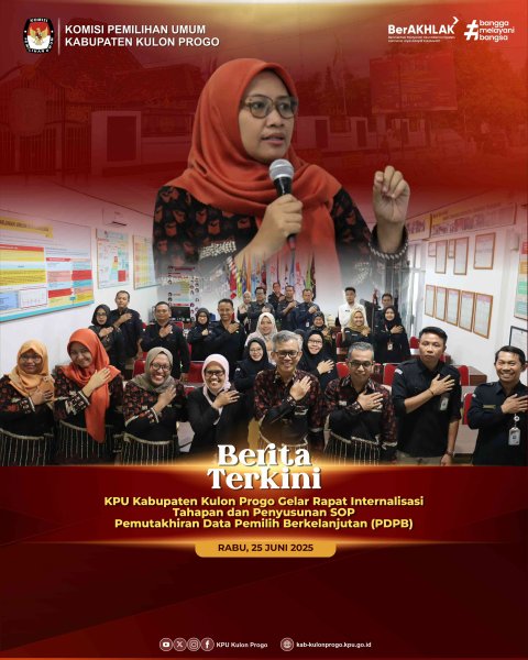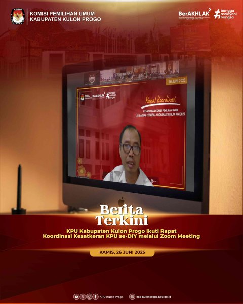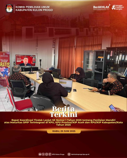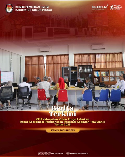Kamis, 26 Juni 2025 Komisi Pemilihan Umum (KPU) Kabupaten Kulon Progo mengadakan acara Rapat Koordinasi Pembahasan Realisasi Kegiatan Triwulan II Tahun 2025 yang dilaksanakan di Pendopo Komisi Pemilihan Umum Kabupaten Kulon Progo, sebagai upaya untuk mengevaluasi realisasi kegiatan serta memastikan seluruh program kerja berjalan sesuai rencana dan target yang telah ditetapkan. Rapat ini dihadiri oleh seluruh jajaran KPU Kabupaten Kulon Progo, mulai dari Ketua dan Anggota, Sekretaris, Kasubbag/staf pelaksana yang membidangi masing-masing divisi terkait di lingkungan KPU Kabupaten Kulon Progo. Rapat ini bertujuan untuk mencermati pelaksanaan kegiatan selama periode April hingga Juni 2025, sekaligus sebagai bahan perbaikan dan penyusunan strategi pelaksanaan program pada triwulan berikutnya. Dalam rapat tersebut, masing-masing divisi memaparkan progres kegiatan yang telah dilaksanakan selama Triwulan II serta tindak lanjut terhadap program-program yang belum terealisasi sepenuhnya termasuk kendala yang dihadapi serta rencana tindak lanjut ke depan. Melalui forum ini, KPU Kabupaten Kulon Progo berharap sinergi antar-divisi dapat terus ditingkatkan guna memperkuat efektivitas pelaksanaan program kerja, serta mendorong seluruh jajaran untuk terus meningkatkan kinerja dan kolaborasi lintas divisi demi tercapainya target yang telah ditetapkan. Selain itu, kegiatan ini juga menjadi wadah evaluasi bersama untuk memastikan bahwa seluruh kegiatan berjalan sesuai regulasi, efisien, dan akuntabel. Ketua KPU Kabupaten Kulon Progo dalam sambutannya menyampaikan pentingnya transparansi dan akuntabilitas dalam pelaksanaan program, serta mendorong seluruh jajaran untuk terus meningkatkan kinerja dan sinergi antar-divisi guna mencapai target yang telah ditetapkan. Selain itu, rapat juga membahas tindak lanjut terhadap program-program yang belum terealisasi sepenuhnya, serta strategi percepatan pelaksanaan kegiatan pada triwulan berikutnya. Harapannya, pelaksanaan program di lingkungan KPU Kabupaten Kulon Progo dapat berjalan efektif, efisien dan sesuai dengan prinsip tata kelola pemerintahan yang baik. -Irv