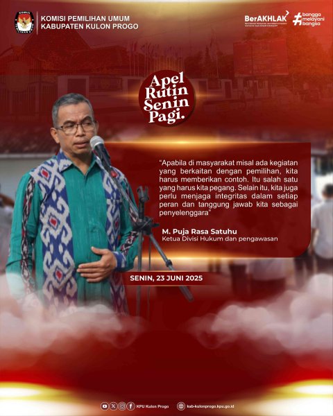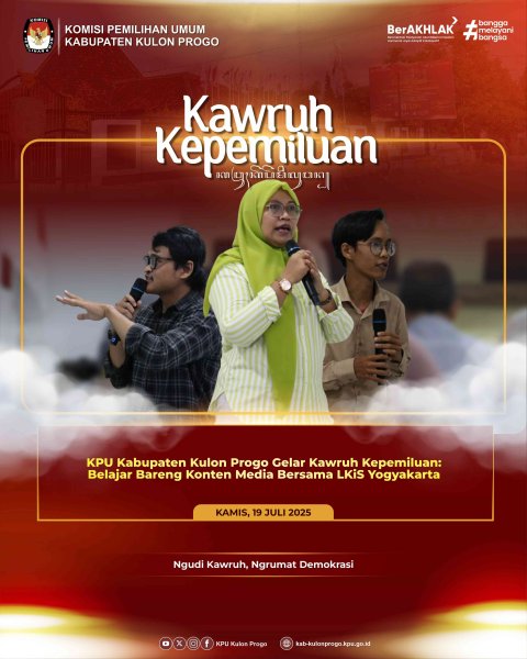 Kulon Progo – KPU Kabupaten Kulon Progo menggelar kegiatan Kawruh Kepemiluan sebagai bagian dari upaya peningkatan literasi demokrasi untuk seluruh pegawai. Mengusung tema "Belajar Bareng Konten Media", acara ini digelar pada 19 Juni 2025, dengan menghadirkan narasumber dari LKiS (Lembaga Kajian Islam dan Sosial) Yogyakarta.