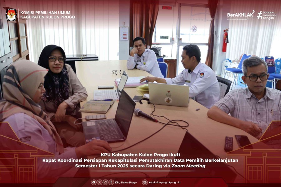 Wates, Kamis, 5 Juni 2025 - KPU Kabupaten Kulon Progo mengikuti kegiatan Rapat Koordinasi Persiapan Rekapitulasi Pemutakhiran Data Pemilih Berkelanjutan Semester I Tahun 2025. Rapat dilaksanakan di ruang Pendopo KPU Kabupaten Kulon Progo via daring yang diikuti oleh Ketua Divisi Perencanaan, Data dan Informasi, Moh Zaenuri Ikhsan dan Wakil Ketua Divisi Perencanaan, Data dan Informasi KPU DIY, Tri Mulatsih, serta seluruh Ketua Divisi Perencanaan, Data dan Informasi, Kepala Sub Bagian yang membidangi Perencanaan, Data dan Informasi serta staf pelaksana atau operator Sidalih di lingkungan KPU se-DIY. PDPB (Pemutakhiran Data Pemilih Berkelanjutan) ini bertujuan untuk Melakukan pemeliharaan dan pembaruan Daftar Pemilih Tetap (DPT) secara terus-menerus dari pemilu/pemilihan terakhir untuk digunakan pada pemilu/pemilihan berikutnya, dengan tetap menjaga kerahasiaan data pemilih serta Menyediakan data dan informasi pemilih secara nasional yang komprehensif, akurat, dan mutakhir untuk menjamin kualitas data pemilih yang valid. Dalam sambutanya, Ketua KPU DIY Ahmad Shidqi menyampaikan bahwa pasca pemilu, fokus utama KPU adalah pemutakhiran data pemilih berkelanjutan melalui rekapitulasi secara berjenjang setiap bulan dan persemester. Tahun 2025 menjadi rekapitulasi semester pertama pasca pemilu. Ia menyebut data akan sedikit mengalami perubahan, seperti pemilih meninggal, pindah domisili, dan pemilih baru. Karena itu, ia menekankan pentingnya data akurat dari KPU kabupaten/kota agar sesuai kondisi faktual di lapangan. Ketua Divisi Perencanaan, Data dan Informasi KPU DIY, Moh Zaenuri Ikhsan menyampaikan bahwa Sesuai regulasi, KPU bertanggung jawab dalam melaksanakan pemutakhiran data pemilih. Data tersebut bersumber dari Ditjen Dukcapil Kemendagri dan telah diturunkan ke KPU Kabupaten/Kota. Saat ini, KPU Kabupaten/Kota dapat mulai mencermati DP4 sebagai dasar untuk menentukan langkah verifikasi dan penyesuaian data selanjutnya. Selanjutnya, Wakil Ketua Divisi Perencanaan, Data, dan Informasi, Tri Mulatsih, menyampaikan bahwa masyarakat dapat berpartisipasi dalam pemutakhiran data pemilih berkelanjutan (PDPB) melalui mekanisme tanggapan masyarakat. Partisipasi ini disalurkan melalui Formulir Model A Tanggapan Masyarakat sebagaimana diatur dalam PKPU Nomor 1 Tahun 2025. Untuk itu, diperlukan publikasi kegiatan PDPB serta kolaborasi dengan Divisi Parmas dan SDM agar masyarakat mengetahui dan dapat melaporkan data pemilih yang belum terdaftar. Kemudian acara dilanjutkan dengan penyampaian progres PDPB (Pemutakhiran Data Pemilih Berkelanjutan) oleh setiap KPU Kabupaten/Kota se-DIY. -Irv