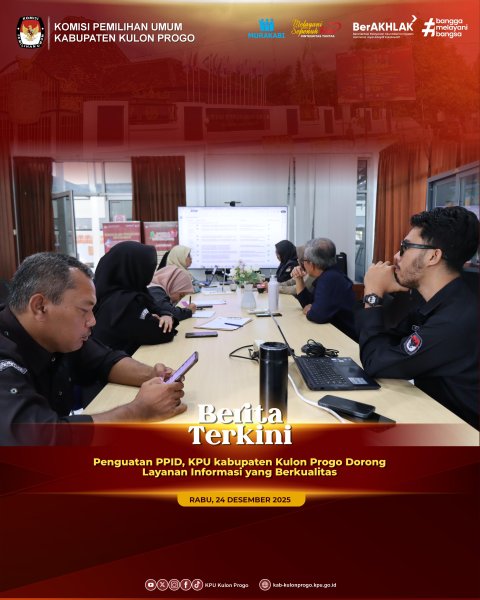 Wates – Komisi Pemilihan Umum (KPU) Kabupaten Kulon Progo melaksanakan kegiatan Rapat Koordinasi Rencana Aksi Kegiatan Divisi Perencanaan, Data, dan Informasi (Rendatin) Tahun 2026 dilaksanakan di Pendopo KPU Kabupaten Kulon Progo pada Selasa (30/12/2025). Kegiatan ini diikuti oleh Ketua Divisi Perencanaan, Data, dan Informasi, kepala subbagian Perencanaan, Data, dan Informasi, serta staf pelaksana pada Bagian Perencanaan, Data, dan Informasi KPU Kabupaten Kulon Progo. Pada kesempatan kali ini, kegiatan dipimpin langsung oleh Ketua Divisi Perencanaan, Data, dan Informasi (Rendatin) KPU Kabupaten Kulon Progo, Ria Harlinawati. Kegiatan ini dilaksanakan sebagai bagian dari upaya penyusunan perencanaan program dan kegiatan Divisi Rendatin tahun 2026 agar lebih terarah, terukur, dan selaras dengan tugas serta fungsi kelembagaan. Dalam rapat tersebut, dibahas berbagai rencana aksi strategis yang difokuskan pada penguatan perencanaan program dan peningkatan kinerja organisasi. Pembahasan meliputi perencanaan dan evaluasi kinerja, perencanaan anggaran serta revisi DIPA, pemutakhiran data pemilih berkelanjutan, pengelolaan standar operasional prosedur (SOP), pengelolaan sistem informasi dan penerapan Sistem Pemerintahan Berbasis Elektronik (SPBE), perjanjian kerja sama, pelaporan pelaksanaan pemilu, pemilihan, dan laporan tahunan, analisis hasil Survei Kepuasan Pengguna (SKP) dan Survei Persepsi Antikorupsi (SPAK), serta pengelolaan website resmi KPU. Penyusunan rencana aksi ini diharapkan mampu menjadi pedoman pelaksanaan kegiatan sepanjang tahun 2026. Melalui rapat koordinasi ini, KPU Kabupaten Kulon Progo berkomitmen untuk terus meningkatkan efektivitas dan akuntabilitas pelaksanaan tugas, sekaligus mendorong terwujudnya pelayanan kelembagaan yang profesional, trukur, dan terarah sesuai dengan rencana strategis serta kebijakan yang berlaku. (Irv)