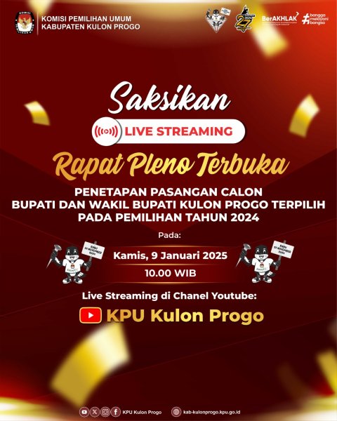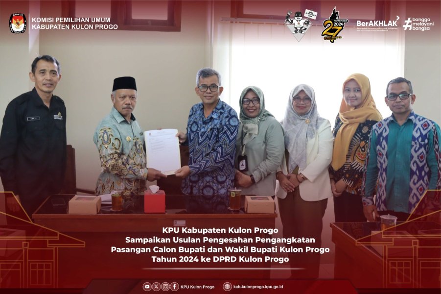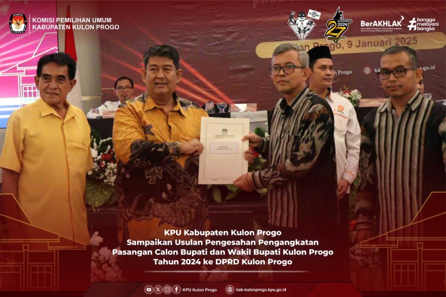 Bertempat di Ruang Arjuna Kantor DPRD Kabupaten Kulon Progo, Jumat, 10 Januari 2025, KPU Kabupaten Kulon Progo yang diwakili oleh Ketua, Anggota, Sekretaris, serta jajaran sekretariat menyampaikan usulan pengesahan pengangkatan pasangan calon Bupati dan Wakil Bupati Kulon Progo Terpilih Tahun 2024 ke DPRD Kabupaten Kulon Progo. Usulan tersebut disampaikan 1 (satu) hari setelah dilakukan Rapat Pleno Terbuka Penetapan Pasangan Calon Terpilih pada 9 Januari 2025 lalu sesuai dengan ketentuan yang berlaku.