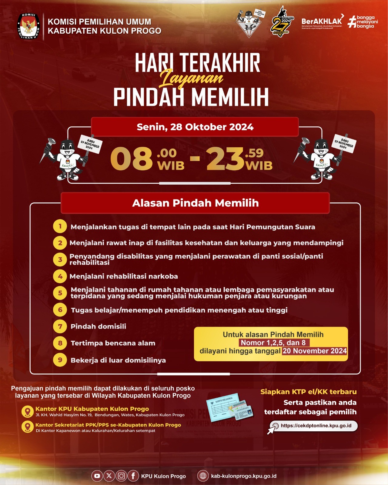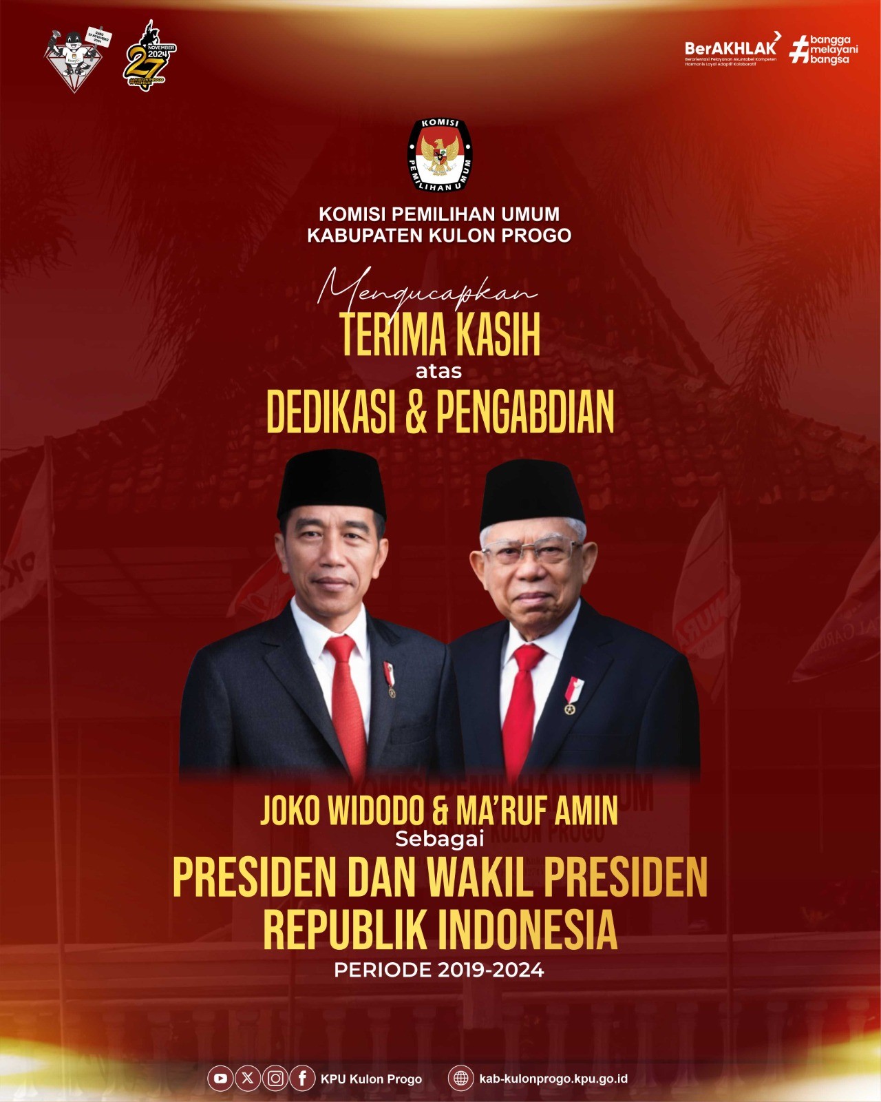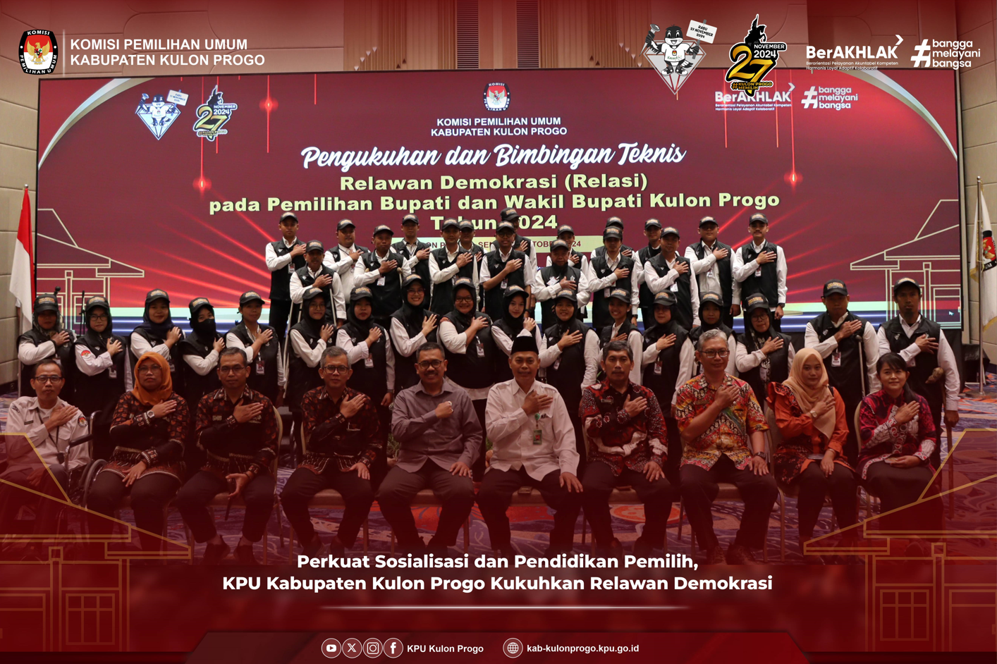 Temon – 14 Oktober 2024, bertempat di Hotel Morazen YIA, KPU Kabupaten Kulon Progo kukuhkan sebanyak 38 Relawan Demokrasi (Relasi) untuk Pemilihan Bupati dan Wakil Bupati Kulon Progo Tahun 2024. Relasi ini nantinya akan menjadi mitra KPU Kabupaten Kulon Progo dalam menjalankan sosialisasi dan Pendidikan pemilih. Relasi ini terbagi dalam 8 basis yaitu; pemilih pemula, muda, keagamaan, penyandang disabilitas, komunitas, marginal, Perempuan, dan warga internet.