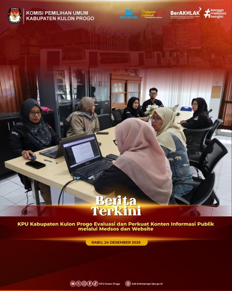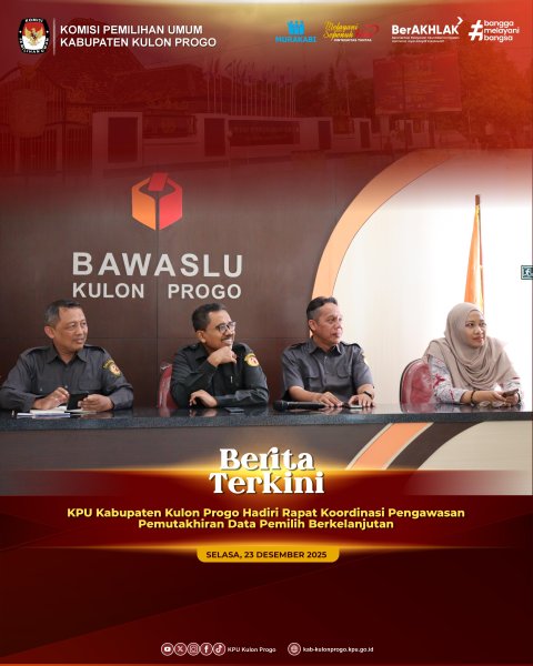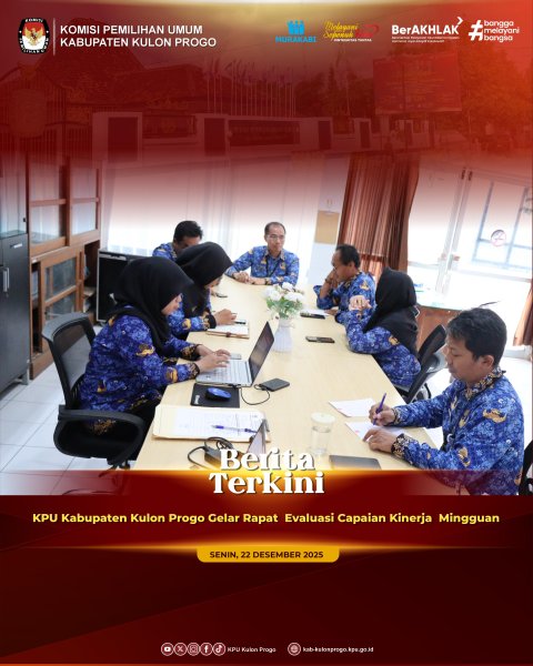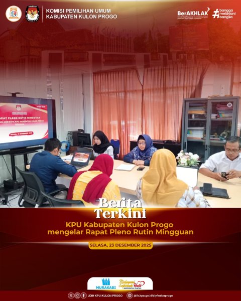 Kulon progo, 23 Desember 2025 Komisi Pemilihan Umum Kabupaten Kulon Progo menggelar Rapat Pleno Mingguan membahas tentang penyampaian hasil tindak lanjut rapat pleno sebelumnya, laporan penggunaan anggaran dan laporan pelaksanaan tugas lainnya secara periodik bertempat di Pendopo KPU Kabupaten Kulon Progo. Rapat Pleno Rutin Mingguan di hadiri Ketua dan Anggota Komisioner, Sekretaris, seluruh Kasubag dan pelaksana Subbag Teknis Penyelenggaraan dan Hukum di KPU Kabupaten Kulon Progo. Rapat dipimpin oleh Ketua KPU Kabupaten Kulon Progo Budi Priyana, Rapat pleno diawali dengan pembacaan Berita Acara rapat pleno tanggal 16 Desember 2025 diantaranya; Dinas Kependudukan dan cacatan sipil Kabupaten Sragen tidak jadi melakukan kunjungan ke KPU Kabupaten Kulon Progo. Barang Milik Negara yang diterima dari Hibah pemerintah Kulon Progo telah diserahkan kepada yang ditetapkan Layanan Helpdesk pemutakhiran data yang dilaksanakan tanggal 11-12 desember 2025 telah berjalan dengan baik Untuk laporan penggunaan anggaran, serapan atau realisasi anggaran hingga bulan Desember 2025 mencapai 99,23 %. Sedangkan Laporan tugas lain secara periodik, masing-masing Ketua Divisi melaporkan ketugasannya. Dari Divisi Teknis Penyelenggaran menyampaikan update pemutakhiran data parpol yang sampai saat ini belum ada perkembangan lagi, serta informasi bahwa ada partai yang mengirimkan SK kepengurusan secara langsung, dan tidak melalui SIPOL. Dari Divisi Keuangan Umum dan Logistik akan segera melaksanakan uji survei terkait Survei Persepsi Kepuasan Pelayanan dan Survei Perilaku Anti Korupsi. Sementara itu dari Divisi Rendatin menyampaikan terkait pelaksanaan kegiatan evaluasi realisasi kegiatan bulan Desember 2025 yang akan direncanakan pada tanggal 31 Desember 2025 melalui daring serta memastikan draft Perjanjian Kinerja KPU dan Sekretaris KPU sudah fix dan akan ditandatangani tanggal 2 Desember 2026. Pada hari yang sama, pukul 13.00 juga akan dilakukan rapat pleno penetapan Berita Acara hasil pemutakhiran data Partai Politik smester 2 Tahun 2025. Selengkapnya di www.jdih.kpu.go.id/diy/kulonprogo