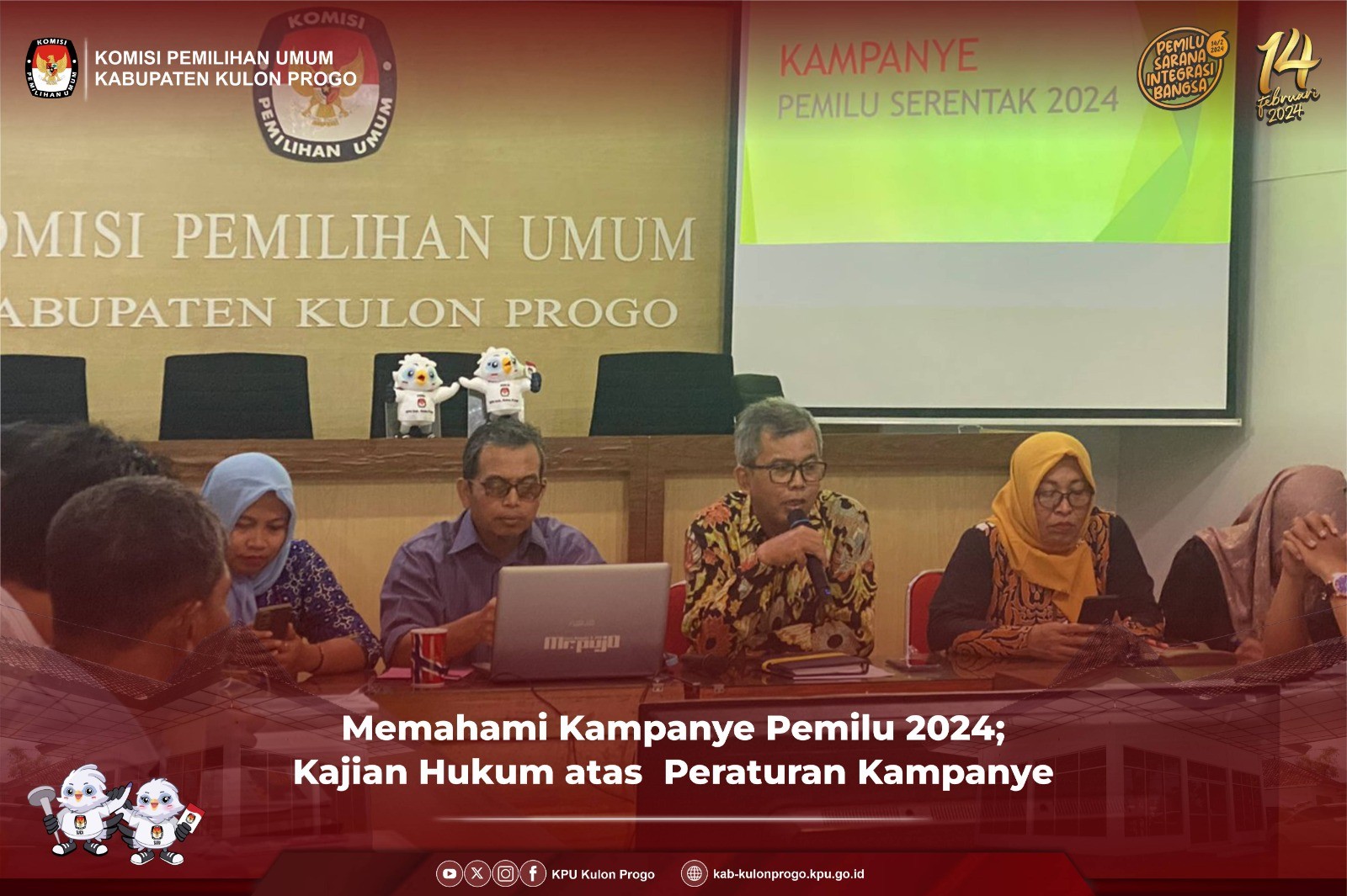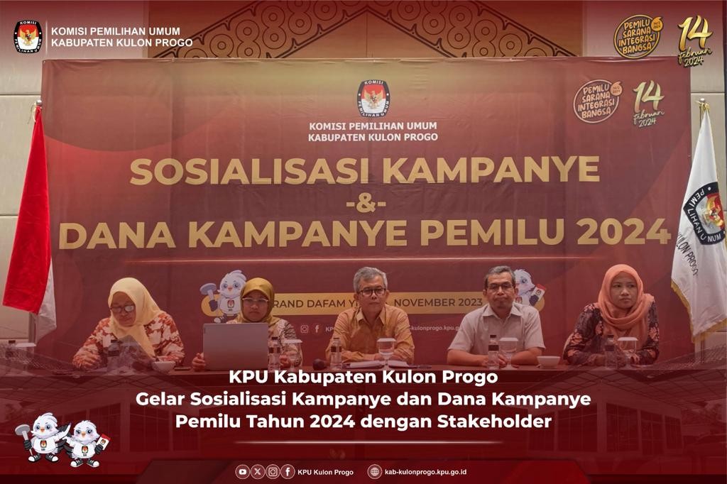 Temon, 24 November 2023 – KPU Kabupaten Kulon Progo mengadakan Rapat Koordinasi Sosialisasi Kampanye dan Dana Kampanye Pemilu 2024 di Hotel Dafam Signature Yogyakarta International Airpot Kulon Progo. Rakor tersebut turut dihadiri oleh Budi Hartono yang mewakili Pj Bupati Kulon Progo, Ipda Afik Widodo dari Polres Kulon Progo, Kapten Arm Mashudi dari Kodim 0731 Kulon Progo, Lajiyo Yok Mulyono dari DPRD Kab. Kulon Progo, Agrin Ika Laras Ati dari IKIP PGRI Wates, unsur Forkompimda, Panewu se-Kabupaten Kulon Progo, Ketua Partai Politik peserta Pemilu 2024, Penghubung Calon DPD RI Daerah Pemilihan Daerah Istimewa Yogyakarta, Ketua Organisasi Keagamaan di Kabupaten Kulon Progo, Ketua Wartawan Kulon Progo, Ketua Paguyuban Wartawan Kulon Progo, dan Karang Taruna Kulon Progo. Acara dibuka dengan sambutan Ketua KPU Kabupaten Kulon Prgo, Budi Priyana. Narasumber pertama disampaikan oleh Bapak Muhadi, S.H., M.Hum. selaku Kabag Hukum Setda Kabupaten Kulon Progo dengan pemaparan tentang dasar hukum Kampanye: PKPU Nomor 15 Tahun 2023 tentang Kampanye Pemilihan Umum, Keputusan Bupati Kulon Progo Nomor 405/C/2023 tentang Lokasi yang Dilarang Untuk Pemasangan Alat Peraga Kampanye dan Bahan Kampanye serta Fasilitas Umum yang Diperbolehkan Sebagai Tempat Kampanye Pemilihan Umum dan Pemilihan Bupati dan Wakil Bupati Tahun 2024. Narasumber selanjutnya adalah Bapak Supiyanto, S.H dari Polres Kulon Progo dengan pemaparan tentang dasar hukum kampanye, latar belakang kampanye, bentuk kampanye, dan surat permohonan untuk kampanye. Narasumber terakhir dari Ikatan Akuntan Indonesia se-Daerah Istimewa Yogyakarta, Ibu Lita Kusumasari dengan pemaparan materi: bentuk dana kampanye, alur pelaporan dana kampanye (LADK : Laporan Awal Dana Kampanye, LPSDK : Laporan Pemberi Sumbangan Dana Kampanye, dan LPPDK : Laporan Penerimaan & Pengeluaran Dana Kampanye). Sebelum acara ditutup, dibuka sesi diskusi terkait dengan pemaparan dari ketiga narasumber. (Uzr)