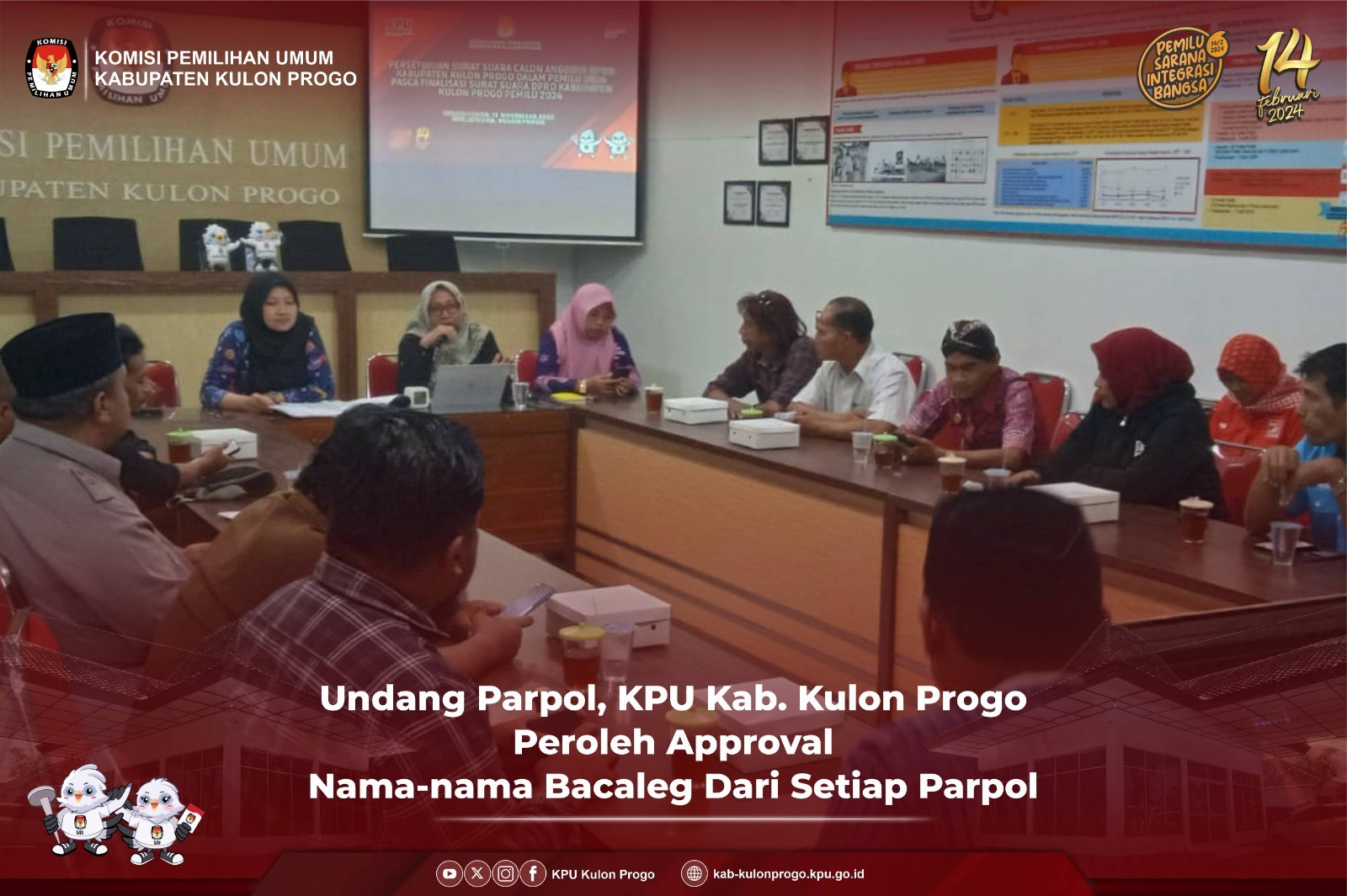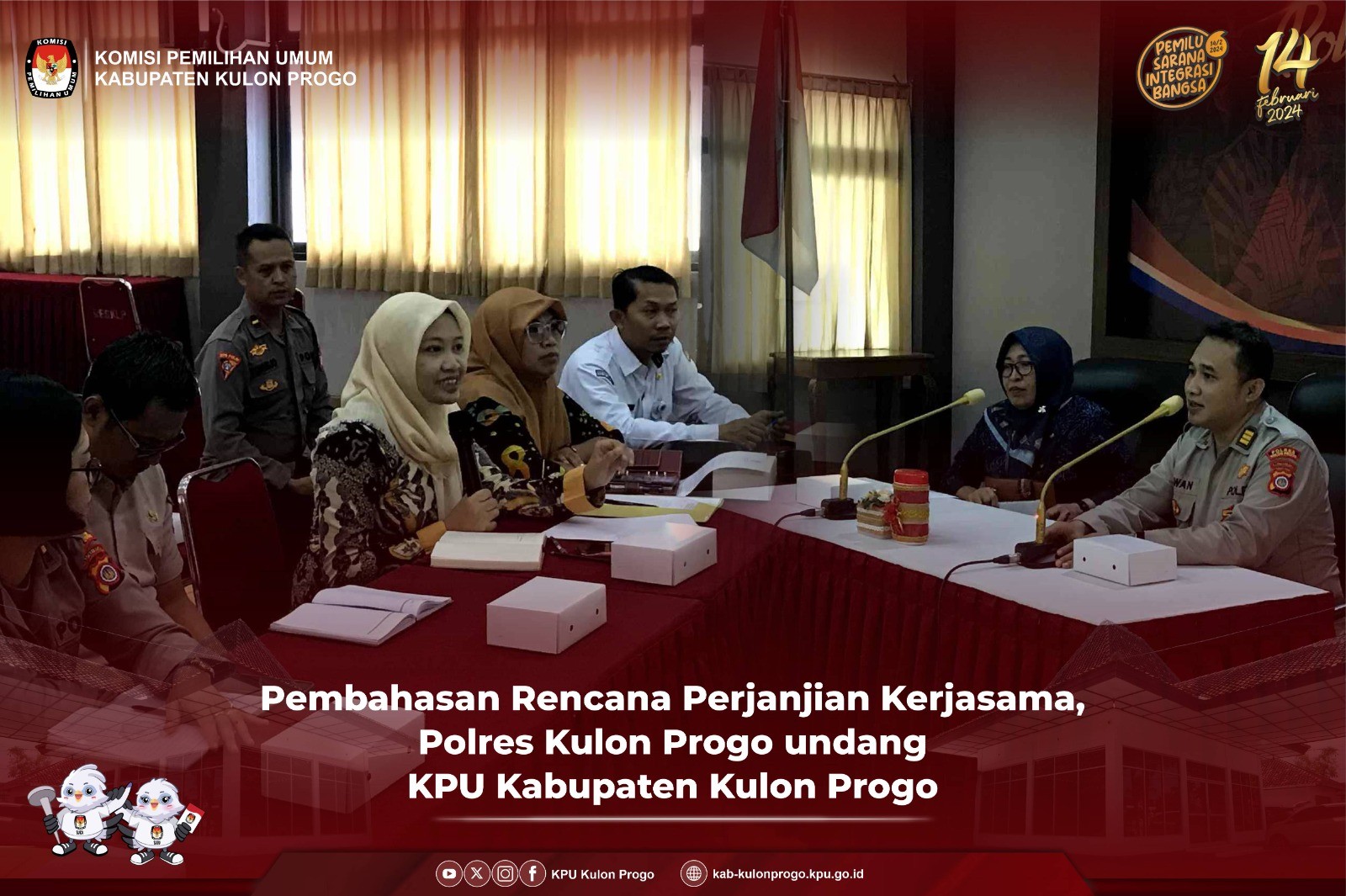 Wates, 16 November 2023 dalam rangka rencana pembuatan Perjanjian Kerjasama (PKs) sebagai tindak lanjut Nota Kesepahaman antara POLRI dengan KPU Republik Indonesia, Polres Kulon Progo mengundang KPU Kabupaten Kulon Progo. Hadir dari KPU Kabupaten Kulon Progo antara lain Kadiv. Teknis Penyelenggaraan Hidayatut Thoyibah, Ria Harlinawati selaku Kadiv. Perencanaan Data dan Informasi, Aris Zurkhasanah selaku Kadiv. Sosialisasi Pendidikan Pemilih Partisipasi masyarakat dan SDM, Aan Rimawanto selaku Kasubag rendatin dan staf sekretariat KPU Kabupaten Kulon Progo. Sedangkan dari Polres Kulon Progo dihadiri oleh AKP. Purnawan Tri Laksono A.Md. IK selaku Kasubag Kerjasama dan jajarannya. Acara dilaksanakan di Kantor Polres Kulon Progo. Pembahasan rencana PKs dibuka oleh Akp. Purnawan Tri Laksono A.Md. IK dengan pengantar bahwa PKs. ini merupakan perintah dari Polda DIY sebagai tindak lanjut Nota Kesepahaman yang telah dilaksanakan oleh KPU RI dengan POLRI. Menurut Akp. Purnawan Tri Laksono A.Md. IK untuk mewujudkan sinergisitas pelaksanaan tugas dan fungsi penyelenggaraan Pemilihan Umum dan Pemilihan Serentak Tahun 2024 di wilayah Kabupaten Kulon Progo maka diperlukan PKS antara Polres Kulon Progo dengan KPU Kabupaten Kulon Progo. Kemudian dilanjutkan dengan penyampaian surat Ketua KPU RI Nomor 1125/PR.07-SD/01/2023 tanggal 12 Oktober 2023 tentang Tindak Lanjut Nota Kesepahaman antara KPU dengan POLRI oleh Hidayatut Thoyyibah selaku Plh. Ketua KPU Kulon Progo. Selanjutnya Ria Harlinawati menjelaskan bahwa Perjanjian Kerja Sama di tingkat kabupaten tidak perlu dilakukan karena telah dilakukan di tingkat provinsi antara KPU DIY dan POLDA DIY. Akhirnya kedua pihak sepakat bahwa PKs. ini menunggu intruksi dari organisasi di atasnya masing-masing. Acara dilanjutkan dengan diskusi pembahasan draft PKs antara KPU Kabupaten Kulon Progo dengan Polres Kulon Progo. Di akhir acara, Akp Purnawan Tri Laksono A.Md. IK menyampaikan bahwa draft PKs yang telah dibahas ini akan segera di ajukan di biro hukum Polda DIY. (Izur)