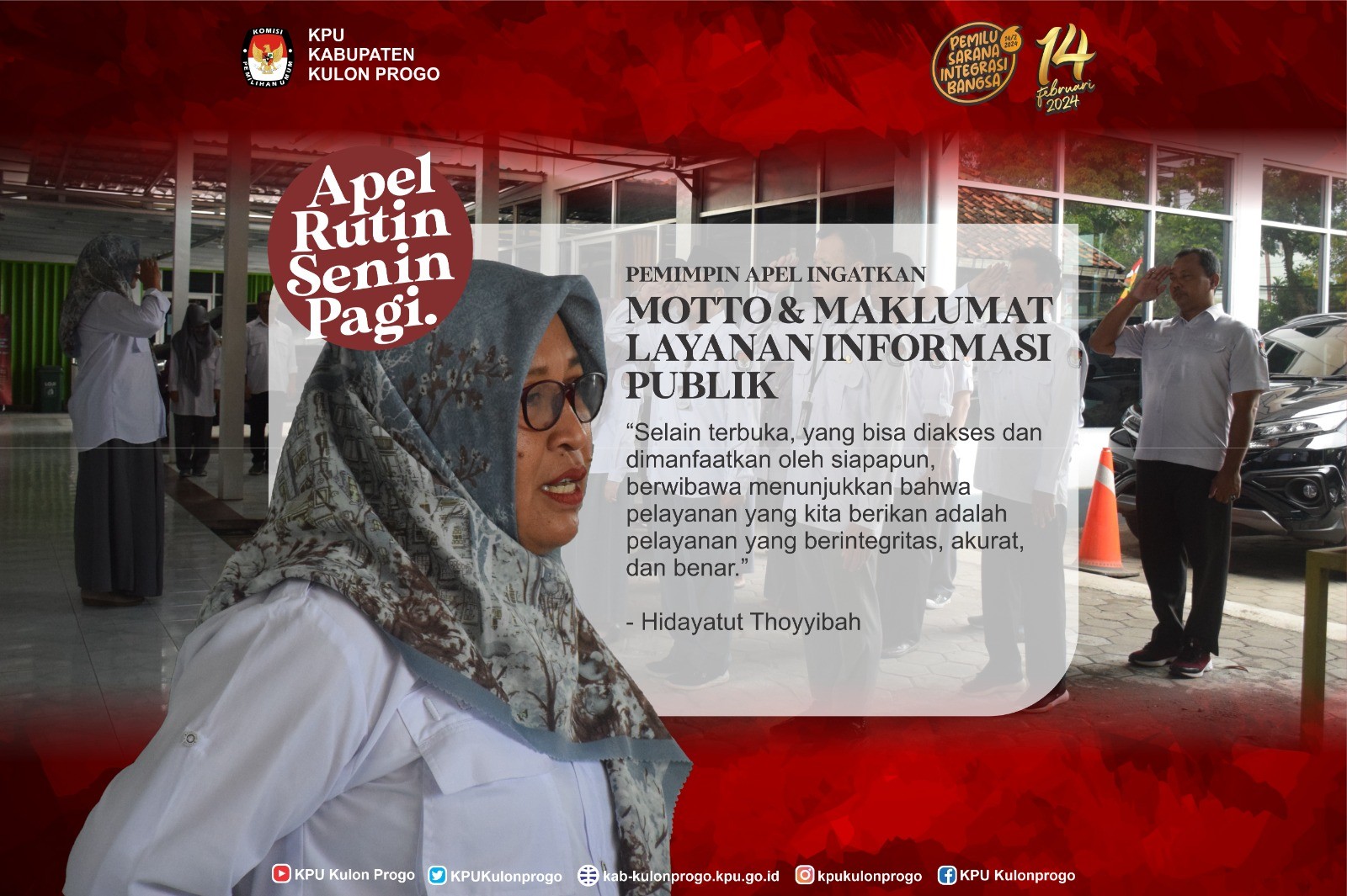 Pada hari senin, 7 Agustus 2023 KPU Kabupaten Kulon Progo melakukan apel rutin yang diikuti oleh seluruh Anggota KPU, Sekretaris, dan jajaran sekretariat. Hidayatut Thoyyibah bertindak menjadi pemimpin apel yang berlangsung di halaman kantor KPU.