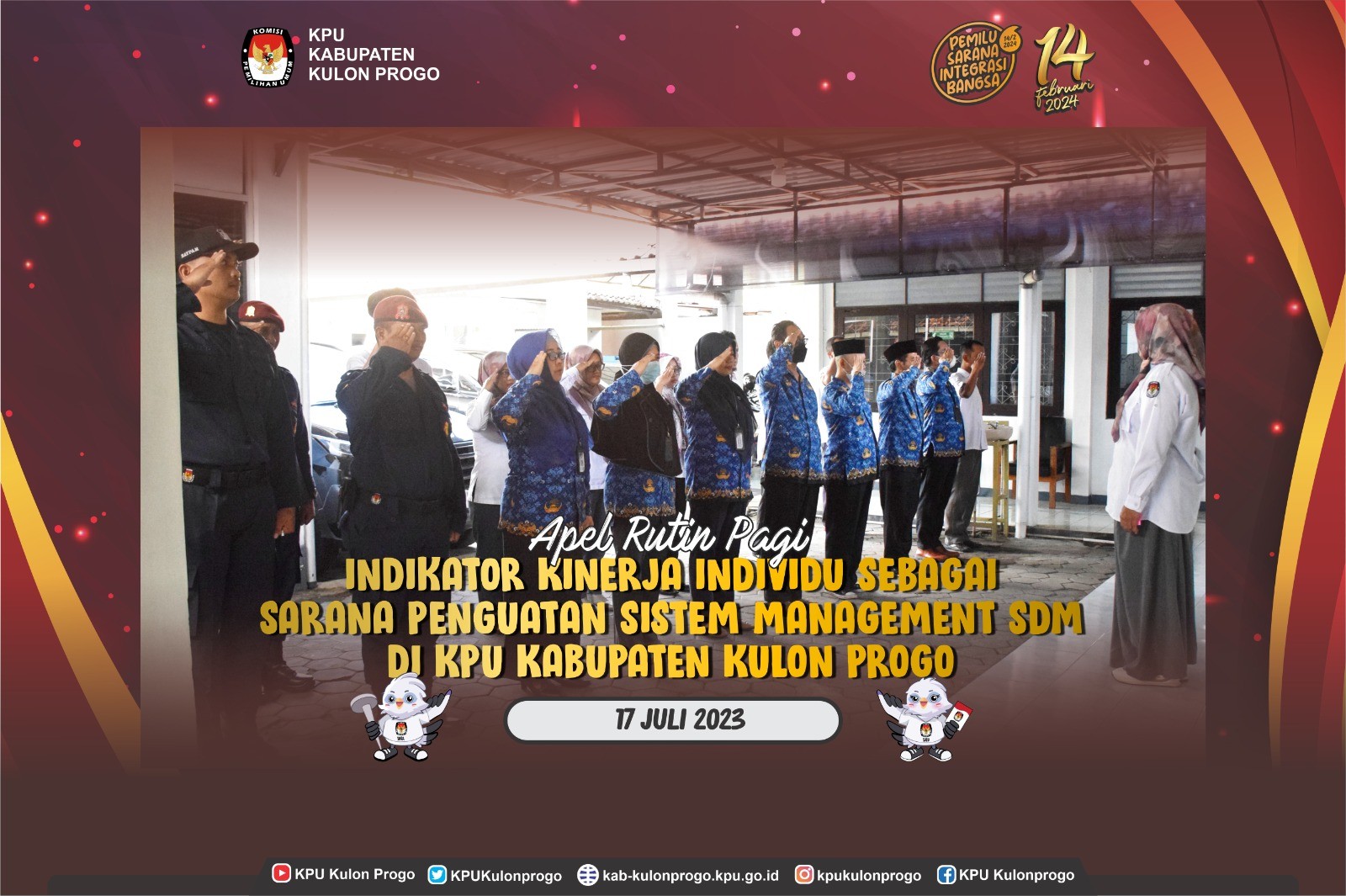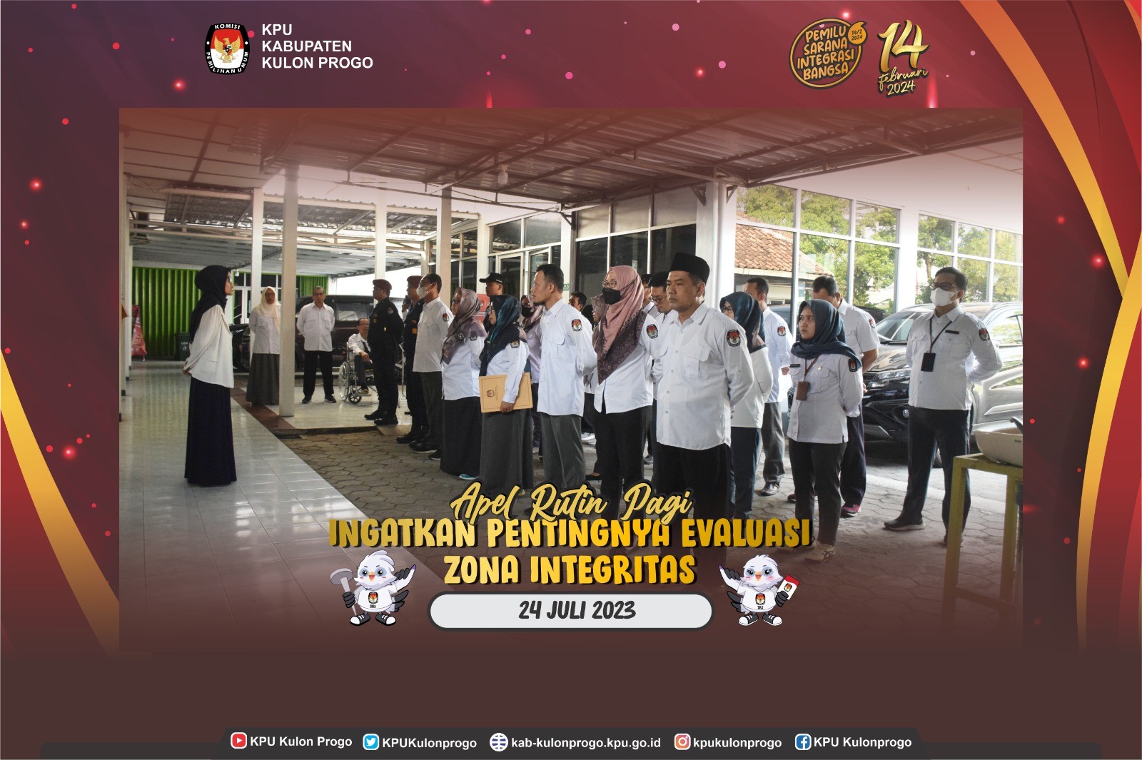 Kulon Progo, Senin 24 Juli 2023 untuk mengawali aktivitas kerja, seluruh jajajaran karyawan dan karyawati KPU Kabupaten Kulon Progo, melaksanakan kegiatan rutin apel Senin pagi sebagai bentuk pendisiplinan Kerja. Dalam apel Senin pagi kali ini diikuti oleh Ketua, Komisioner, Kasubag serta seluruh staff, dan PPNPN KPU Kabupaten Kulon Progo, dengan pembina Apel Ketua KPU Kabupaten Kulon Progo Ibah Muthiah. Dalam amanatnya, Ibah Muthiah kembali mengingatkan akan pentingnya Evaluasi Zona Integritas. Ketua KPU Kabupaten Kulon Progo mengharapkan agar Pembangunan Zona Integritas menuju Wilayah Bebas Korupsi dan Wilayah Birokrasi Bersih Melayani terus diupayakan oleh KPU Kabupaten Kulon Progo. Selain itu Ibah Muthiah mengharapkan evaluasi ZI yang di dalamnya mencakup 6 aspek yang meliputi, Managemen Perubahan, Penataan Tata Laksana, Penataan SDM, Penguatan Akuntabilitas Kerja, Penguatan Pengawasan dan Penguatan Kualitas Pelayanan, "hususnya, seperti survey kepuasan masyarakat, juga dilakukan kembali, paling lambat akhir minggu ini harus dilakukan lagi”. Ibah megingatkan setelah apel, akan dilanjutkan pencermatan kembali Vermin administrasi perbaikan Bakal Calon ANggota Legislatif DPRD Kabupaten Kulon Progo sampai Selasa 25 Juli 2023. Hasil Selasa, 25 Juli 2023 juga akan dilakukan Serabi Pemilu di Kapanewon Temon, dilanjutkan Pleno Progress Report dan Evaluasi RB ZI. Pada hari Rabu, 26 Juli 2023 Penguatan Kelembagaan, Kamis, 27 Juli 2023 Pemaparan Hasil Vermin Perbaikan ke Pleno dan di hari Jumat, 28 Juli 2023 klarifikasi hasil Vermin perbaikan serta rapat Mutarlih DPTB.” Jelas Ibah Muthiah selaku Ketua KPU Kabupaten Kulon Progo. (IR)