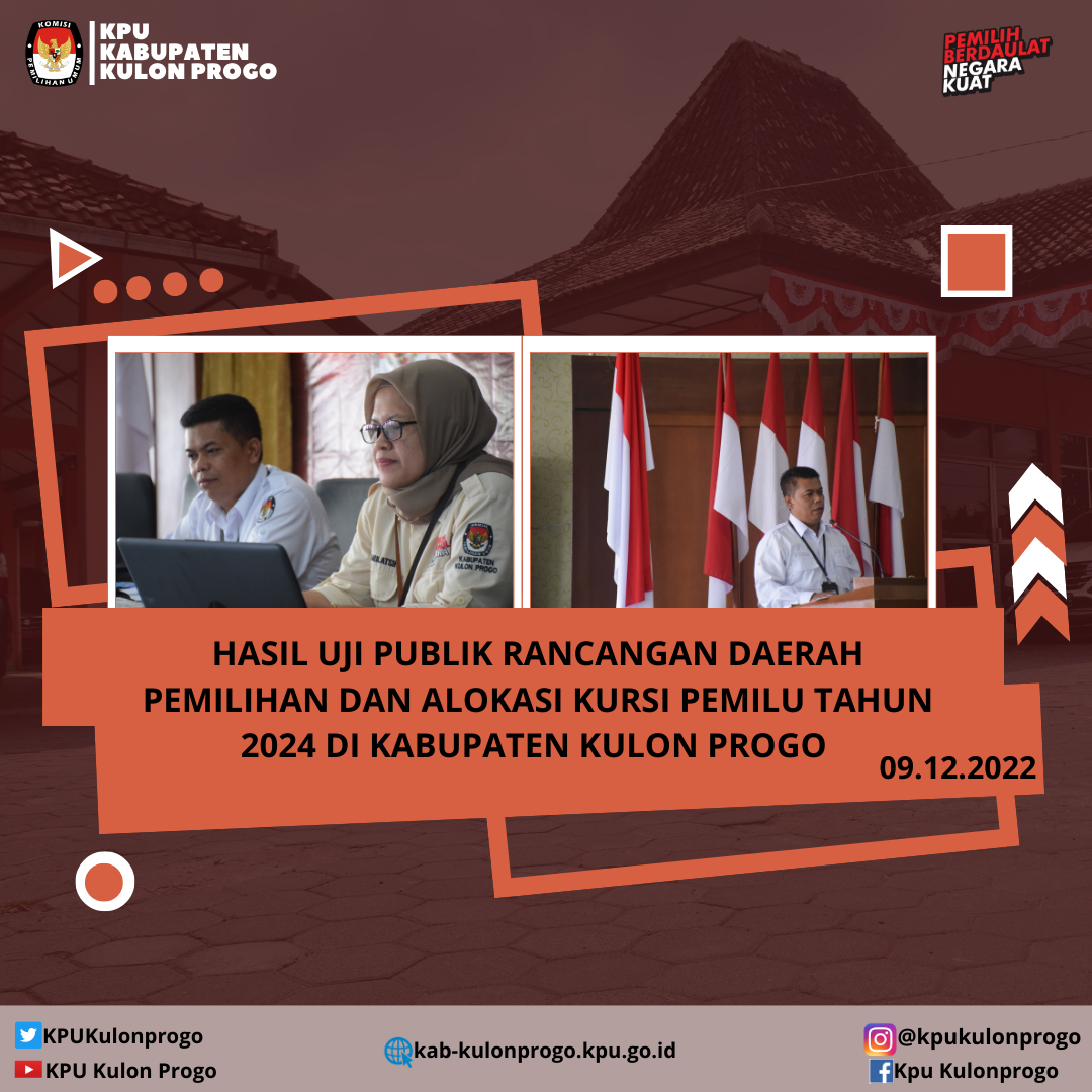 KPU Kabupaten Kulon Progo sudah melaksanakan uji publik sesuai tahapan Penataan Daerah Pemilihan (Dapil) pada hari Jumat, 9 Desember 2022 bertempat di Ruang Adikarto Pemerintah Kabupaten Kulon Progo. Kegiatan uji publik ini diikuti oleh 7 unsur yaitu Pemerintah Kabupaten Kulon Progo, Partai Politik tingkat Kabupaten Kulon Progo, Bawaslu Kabupaten Kulon Progo, pemantau Pemilu, akademisi, tokoh masyarakat/tokoh adat dan pemangku kepentingan lainnya.