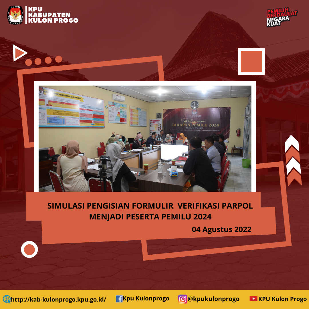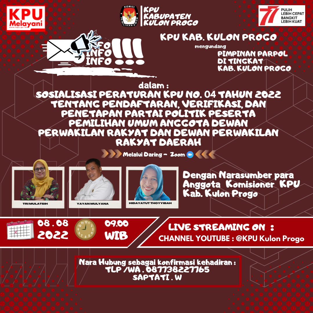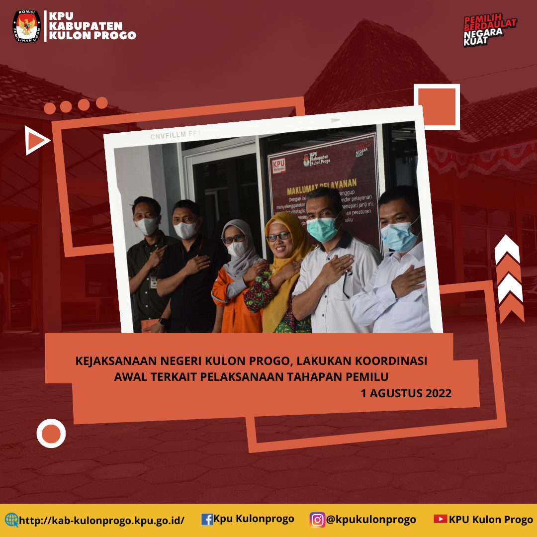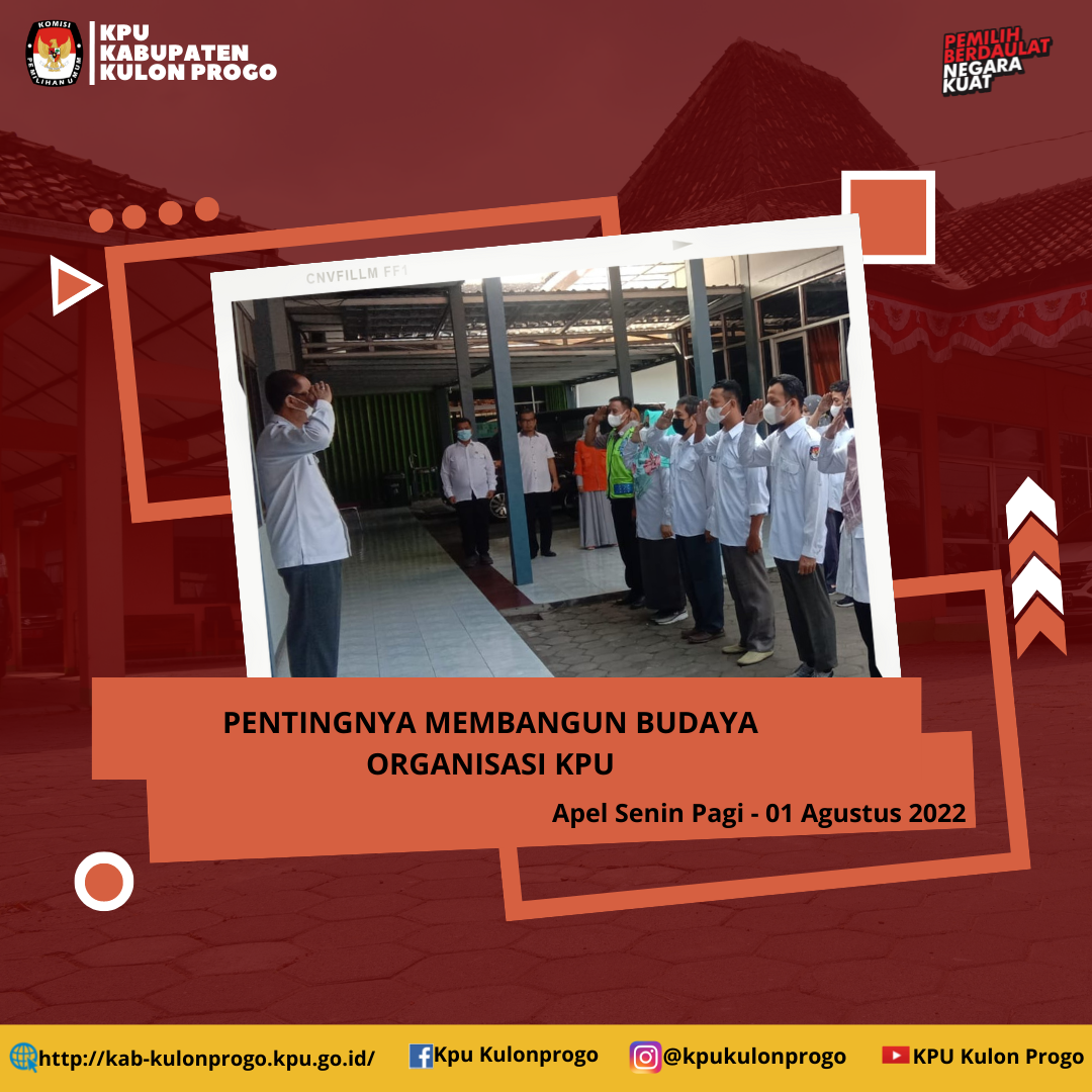 Bertempat di halaman KPU Kabupaten Kulon Progo, telah dilaksanakan apel pagi, pada hari Senin, 1 Agustus 2022. Widi Purnama, Sekretaris KPU Kabupaten Kulon Progo, bertindak menjadi pemberi amanah pada acara apel.