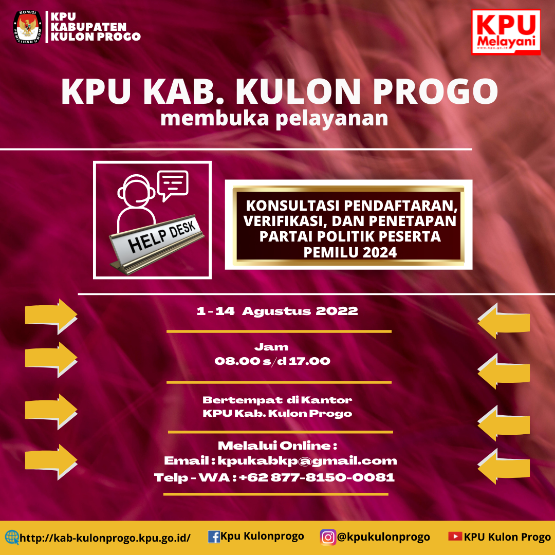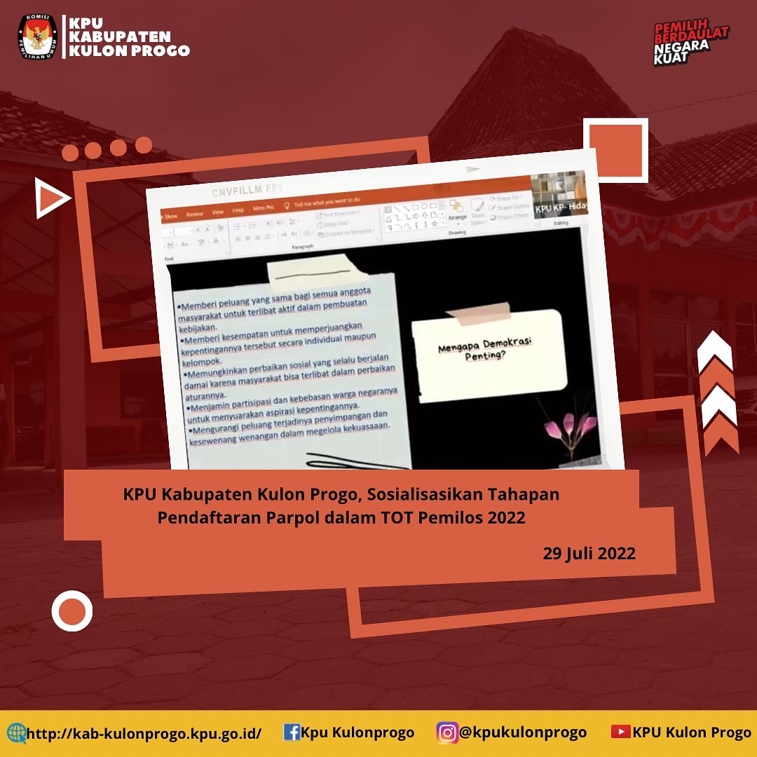 Wates, 29 Juli 2022 Selama dua hari, tanggal 28 dan 29 Juli 2022, KPU Kabupaten Kulon Progo menjadi salah satu pembicara dalam TOT Pemilihan OSIS (Pemilos) yang digelar oleh Badan Kesatuan Bangsa dan Politik Kabupaten Kulon Progo. Pemilos merupakan sarana pendidikan pemilih khusus bagi pemilih pemula. Kegiatan ini diawali dengan penyampaian Surat Pemerintah Kabupaten Kulon Progo Nomor 180/2280 tentang Pemilos Serentak Tahun 2022. Surat dimaksud, meminta SMP, MTs, SMA, SMK dan MA agar menyelenggarakan Pemilos secara serentak dengan tahapan yang telah ditentukan. Dalam TOT yang diikuti oleh Penyelenggara Pemilihan OSIS (PPO) dan Pendamping OSIS, Hidayatut Thoyyibah, Anggota KPU Kabupaten Kulon Progo menjadi pemateri. Hidayatut menyampaikan topik tentang Pemilos sebagai miniatur Pemilu. Lebih lanjut Hidayatut menjelaskan bahwa Tahapan Pemilos menyesuaikan dengan Tahapan Pemilu berupa Pendaftaran Peserta Pemilos, Verifikasi dan Penetapan peserta Pemilos. "Dalam Pemilu 2024, Tahapan Pendaftaran Administratif Partai Politik dilakukan dari tanggal 1 sampai dengan 14 Agustus 2022" tuturnya. Diharapkan dengan mengikuti TOT Pemilos sekaligus mempraktekkan Penyelenggaraan Pemilos, PPO akan memahami sekaligus siap menjadi Penyelenggara Pemilu. (I'd)