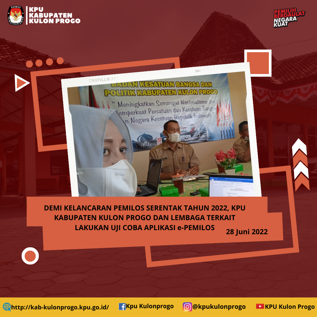 Pada hari Selasa, 28 Juni 2022, KPU Kabupaten Kulon Progo menghadiri undangan Kepala Badan Kesatuan Bangsa dan Politik Kabupaten Kulon Progo untuk melakukan uji coba aplikasi e-Pemilos. Dalam sambutan pembukaan pertemuan, Mudopati Purbohandowo, Kepala Bidang Politik Dalam Negeri Badan Kesatuan Bangsa dan Politik Kabupaten Kulon Progo, menegaskan bahwa aplikasi e-Pemilos secara umum masih seperti tahun-tahun sebelumnya. Terdapat penyesuaian pelaksanaan Pemilos Tahun 2022 karena memasuki fase endemi, dimana sekolah sudah memberlakukan kegiatan belajar mengajar secara tatap muka. Pertimbangan ini mengakibatkan Pemilihan OSIS Tahun 2022 akan dilakukan secara langsung dengan menggunakan Tempat Pemungutan Suara (TPS) di sekolah. Siswa akan memilih dengan aplikasi e-Pemilos melalui perangkat komputer di setiap TPS. Metodenya jauh lebih mudah dan lebih mendekati pemilihan yang sesunguhnya, dimana pemilih hadir dan memilih di TPS, imbuh Mudopati. Ahwan dari Dinas Komunikasi dan Informatika Kabupaten Kulon Progo menunjukkan pengoperasian aplikasi e-Pemilos untuk admin sekolah dan untuk pemilih. Secara aklamasi peserta koordinasi ujicoba aplikasi e-Pemilos menyepakati fitur-fitur yang ada dan akan mendukung seluruh Tahapan Pemilos. (I'd)