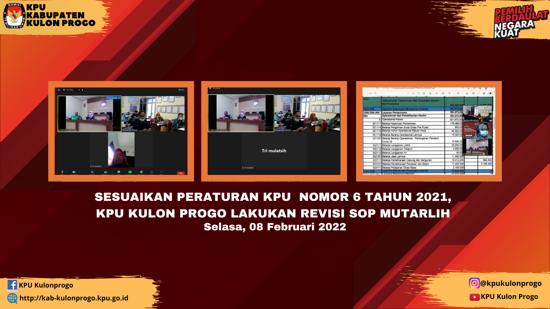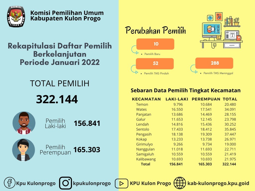 KPU Kabupaten Kulon Progo telah melaksanakan pembaruan data pemilih untuk bulan Januari 2022. Bertempat di Ruang Rapat KPU Kabupaten Kulon Progo, Daftar Pemilih berkelanjutan (DPB) periode bulan Januari tahun 2022 berhasil ditetapkan. Berdasarkan ketentuan Peraturan Komisi Pemilihan Umum Nomor 6 Tahun 2021 perihal Pemutakhiran Data Pemilih Berkelanjutan, hasil Rapat Koordinasi yang dilakukan oleh Komisi Pemilihan Umum Kabupaten Kulon Progo menghasilkan Rekapitulasi Daftar Pemilih Berkelanjutan dengan jumlah sebanyak 322.144 orang dengan rincian pemilih laki-laki berjumlah 156.841 orang dan pemilih perempuan berjumlah 165.303 orang, tersebar di 12 Kapanewon/Kecamatan.