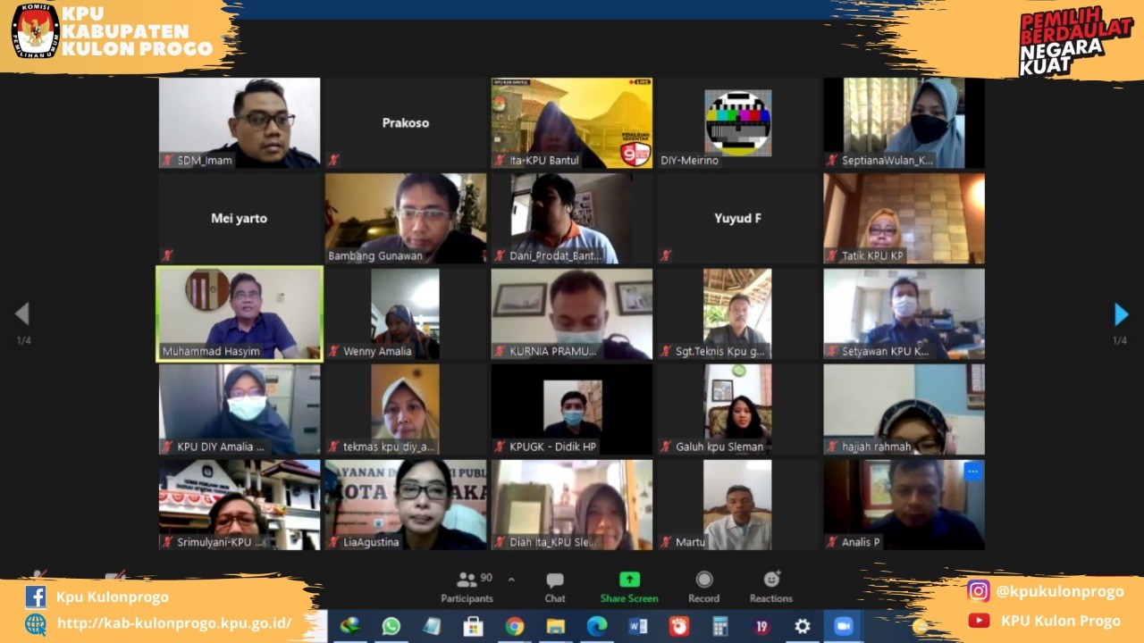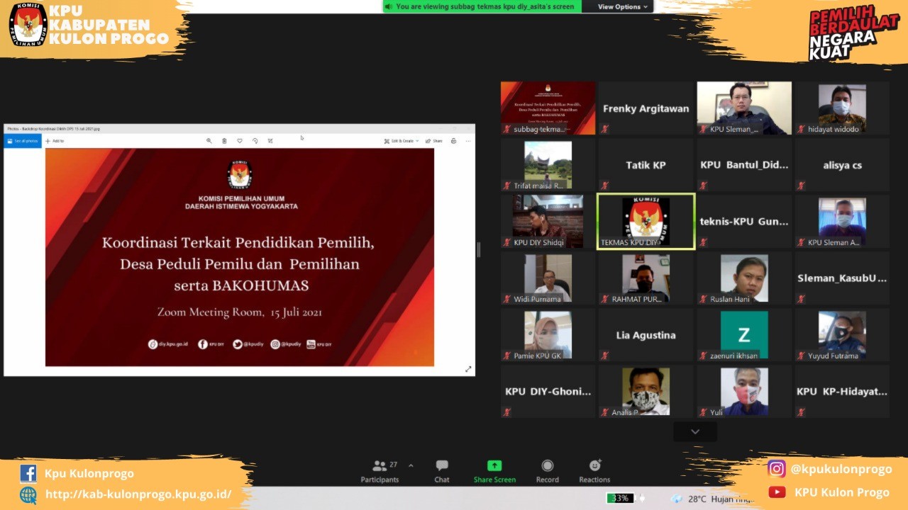 KPU DIY melaksanakan rapat koordinasi isu-isu peningkatan Partisipasi Masyarakat pada hari Kamis, 15 Juli 2021. Kegiatan ini diikuti oleh komisioner dan jajaran sekretariat KPU DIY, serta ketua, sekretaris, ketua Divisi Partisipasi masyarakat dan Kasubag hubungan masyarakat see Kabupaten/Kota se DIY. Pada Rapat koordinasi yang dipimpin oleh Ketua Divisi Partisipasi Masyarakat DIY, Ahmad Sidqi ini, dibahas isu-isu keparmasan diantaranya progress persiapan kegiatan Desa Peduli Pemilu dan Pemilihan (DP3), Badan Koordinasi Kehumasan dan agenda Pendidikan Pemilih di setiap KPU Kabupaten/Kota. Dalam sambutannya Kadiv. Parmas KPU DIY meminta agar setiap KPU Kabupaten/Kota menginformasikan kegiatan yang sudah dilakukan di masing-masing Kabupaten terkait tiga isu utama tersebut. Dalam tanggapannya Ghoniyatun salah Kadiv. Hukum dan Pengawasan KPU DIY menyampaikan, bahwa dalam proses koordinasi ini, masing-masing KPU Kabupaten/Kota bisa saling berbagi informasi tentang upaya peningkatan Partisipasi Masyarakat, bisa saling berbagi strategi dan bisa saling menginspirasi. "Untuk pendidikan Pemilih Pemula bisa belajar dari program Pemilos daring KPU Kabupaten Kulon Progo, untuk belajar tentang pengembangan Desa Pelopor Demokrasi yang melibatkan banyak pihak, bisa belajar dari KPU Kabupaten Bantul, begitupun program yang lainnya bisa belajar dari Kabupaten/Kota yang lainnya" Tuturnya. Agenda koordinasi keparmasan akan menjadi ajang untuk saling menginspirasi, agar KPU Kabupaten/Kita se DIY dapat maju bersama. (Ida)