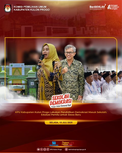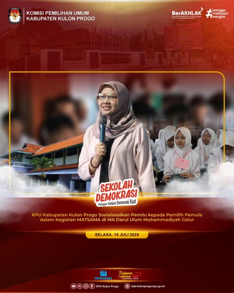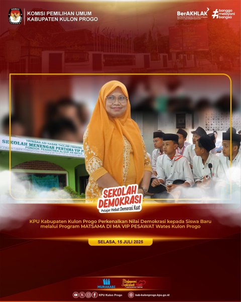 Wates, 15 Juli 2025, KPU Kabupaten Kulon Progo ikut berpartisipasi dalam kegiatan Masa Ta'aruf Siswa Madrasah (MATSAMA) MAN 2 Kulon Progo dengan melaksanakan sosialisasi pendidikan pemilih. Kegiatan MATSAMA MAN 2 Kulon Progo ini diikuti oleh 240 siswa baru. Hadir dalam kegiatan ini Ketua Divisi Sosialisasi, Pendidikan Pemilih, Partisipasi Masyarakat dan SDM KPU DIY, Sri Surani sekaligus sebagai narasumber didampingi Ketua KPU Kabupaten Kulon Progo, Budi Priyana beserta jajaran sekretariat. Download gambar Dalam materinya, Sri Surani menyampaikan hal-hal yang berkaitan dengan kepemiluan. Dalam sesi ini juga diselingi pembagian doorprize kepada peserta MATSAMA yang dapat menjawab pertanyaan dari narasumber dengan benar. Setelah sesi pemaparan materi, dilanjutkan dengan pemutaran video "Mengenal Pemilu". Sebagai penutup, perwakilan siswa dan guru memberikan testimoni terkait kegiatan sosialisasi pendidikan pemilih pada masa MATSAMA yang dilaksanakan KPU DIY dan KPU Kabupaten Kulon Progo. -Asr Download gambar Download gambar Download gambar
