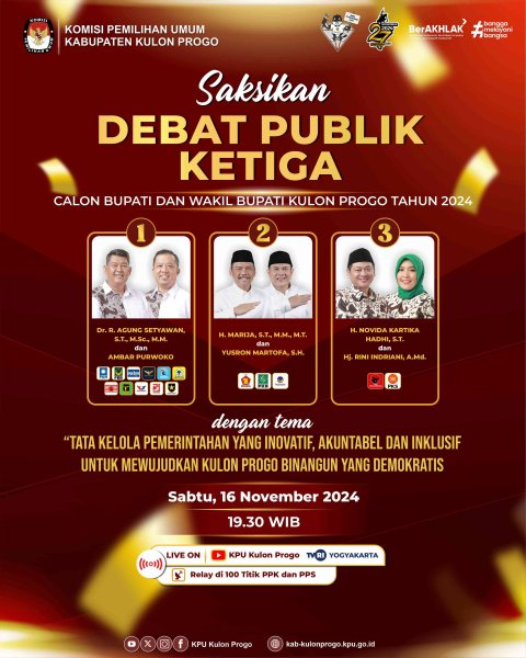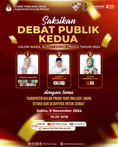 #TemanPemilih, Saksikan Debat Publik Kedua Calon Wakil Bupati Kulon Progo Tahun 2024 pada Hari Sabtu, 9 November 2024, Pukul 19.30 WIB yang dapat di saksikan di TVRI Yogyakarta dan Chanel Youtube KPU Kulon Progo, dengan tema "Kabupaten Kulon Progo yang Inklusif, Aman, Setara, dan Sejahtera untuk Semua"