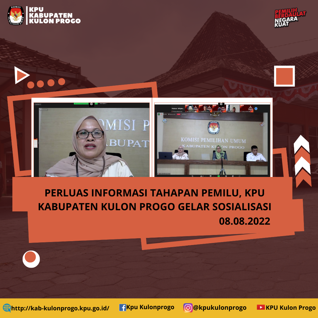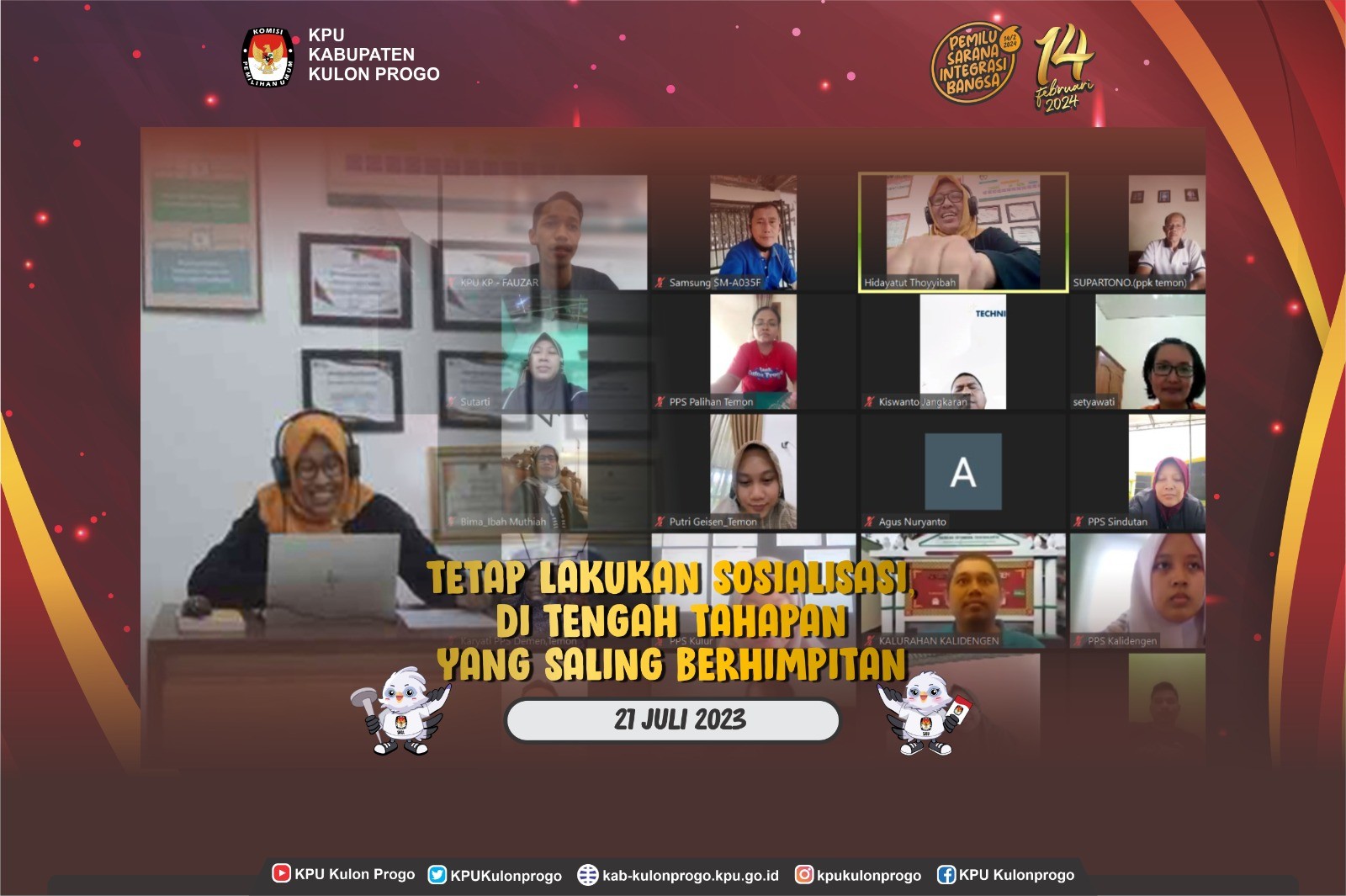 Senin, 8 Agustus 2022 KPU Kabupaten Kulon Progo menggelar kegiatan Sosialisasi Tahapan Pemilu melalui aplikasi zoom dan disiarkan secara langsung melalui kanal youtube KPU Kabupaten Kulon Progo. Hadir pada kesempatan tersebut jajaran Forkompinda Kabupaten Kulon Progo, instansi terkait, partai politik calon peserta Pemilu, tokoh masyarakat dan media. Sebagai narasumber kegiatan sosialisasi adalah anggota KPU Kabupaten Kulon Progo yaitu Hidayatut Thoyyibah, Tri Mulatsih dan Yayan Mulyana. Hidayatut, Ketua Divisi Sosialisasi, Pendidikan Pemilih, Partisipasi Masyarakat dan SDM, menyampaikan terkait Peraturan KPU Nomor 3 Tahun 2022 tentang Tahapan dan Jadwal Penyelenggaraan Pemilu 2024, dimana secara garis besar tahapan Pemilu terdiri dari 11 tahapan yaitu (1) Perencanaan program dan anggaran serta penyusunan peraturan pelaksanaan penyelenggaraan Pemilu, (2) Pemutakhiran data pemilih dan penyusunan daftar pemilih, (3) Pendaftaran dan verifikasi partai politik, (4) Penetapan peserta Pemilu, (5) Penetapan jumlah kursi dan penetapan daerah pemilihan, (6) Pencalonan, (7) Kampanye, (8) Masa tenang, (9) Pemungutan dan penghitungan suara, (10) Penetapan hasil Pemilu, dan (11) Pengucapan sumpah janji. Sementara itu Tri Mulatsih selaku Ketua Divisi Teknis Penyelenggaraan Pemilu, menyampaikan alur inti kegiatan pendaftaran partai politik peserta Pemilu 2024, yang terdapat dalam Peraturan KPU Nomor 4 tahun 2022. Kegiatan pada tahapan tersebut meliputi (1) Pengumuman pendaftaran, (2) Pendaftaran, (3) Verifikasi administrasi, (4) Penyampaian hasil verifikasi administrasi ke Partai Politik dan Bawaslu, (5) Masa perbaikan dokumen, (6) Verifikasi administrasi perbaikan, (7) Penyampaian dan pengumuman hasil rekapitulasi ke Partai Politik dan Bawaslu, (8) Verifikasi faktual kepengurusan dan keanggotaan, (9) Penyampaian hasil ke Partai Politik dan Bawaslu, (10) Masa perbaikan, (11) Verifikasi faktual perbaikan, (12) Penetapan, dan (13) Pengumuman partai politik. Sebagai narasumber ketiga Yayan Mulyana, Ketua Divisi Perencanaan Data dan Informasi, menyampaikan pentingnya pemutakhiran Daftar Pemilih Berkelanjutan (DPB) yang sudah secara rutin dilakukan KPU di semua tingkatan paska Pemilu Serentak 2019. Pentingnya DPB bagi pemilih adalah sebagai jaminan hak bahwa dirinya sudah terdaftar sebagai pemilih. Sedangkan bagi anggota Partai Politik, dokumen yang memenuhi syarat sebagai anggota Partai Politik, adalah yang sudah terdaftar dalam DPB. Beberapa pertanyaan yang menjadi perhatian peserta adalah terkait jadwal dan persyaratan rekrutmen PPK, PPS, mekanisme verifikasi faktual baik keanggotaan atau kepengurusan dan petugas yang melakukan verifikasi faktual. Diakhir diskusi Tri Mulatsih menyampaikan pentingnya dukungan semua pihak untuk kelancaran Pemilu 2024 (Tri) #KPUMelayani #pemiluserentak2024