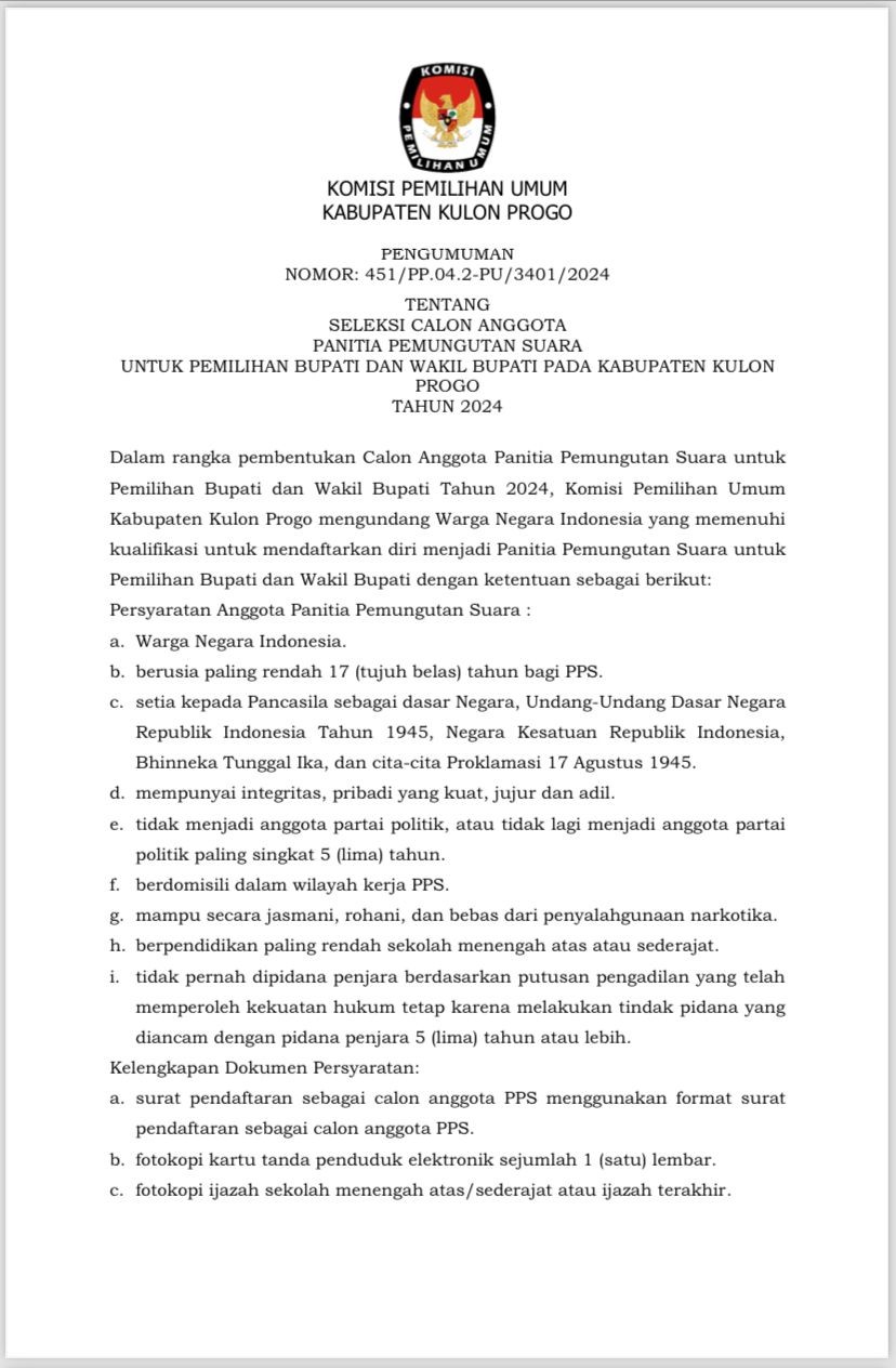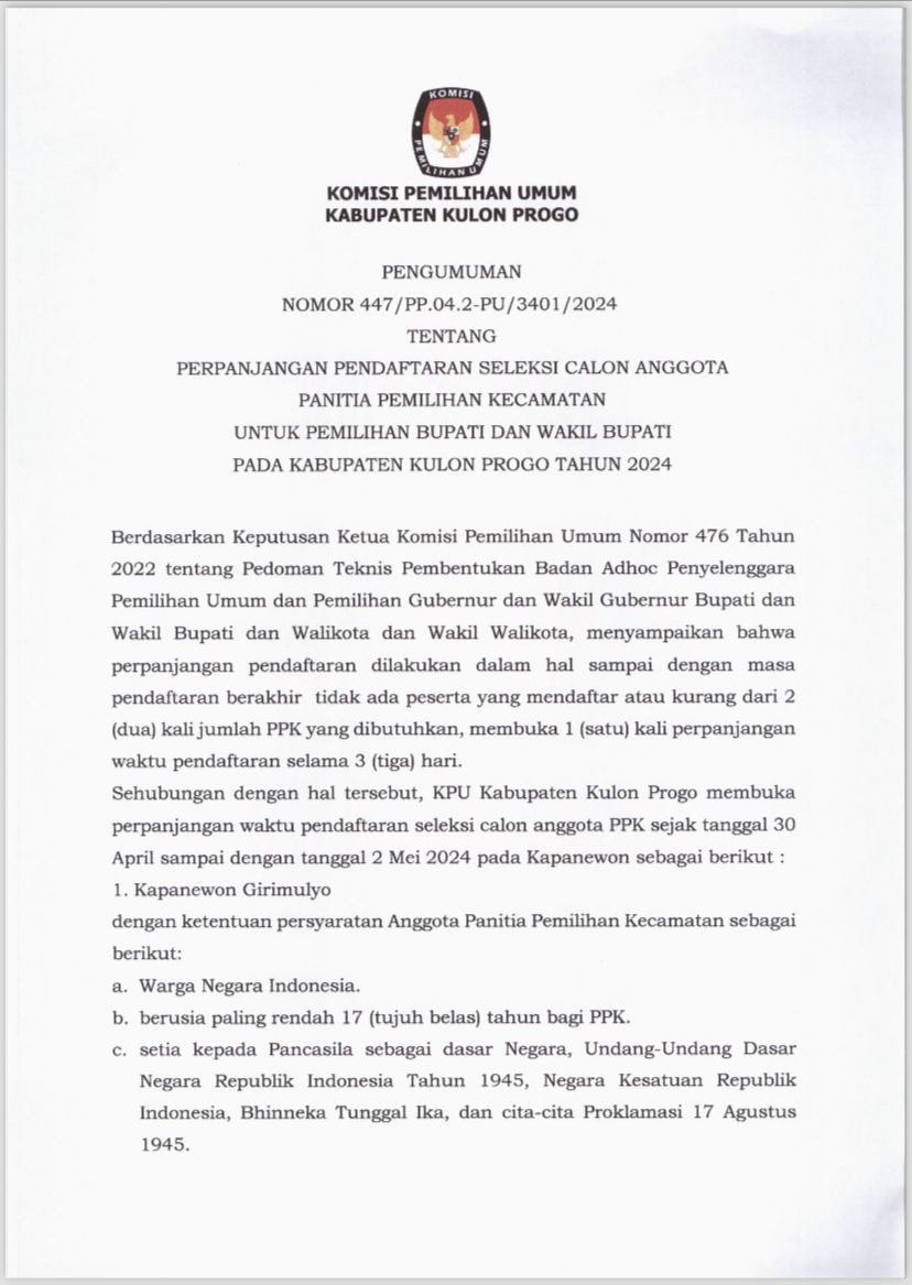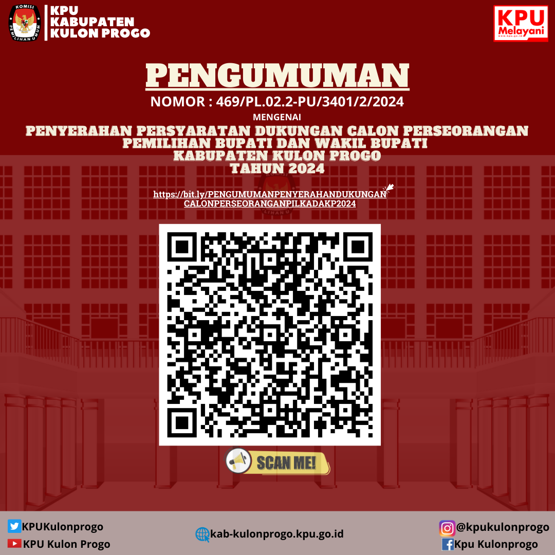 PENGUMUMAN NOMOR : 469/PL.02.2-PU/3401/2/2024 TENTANG PENYERAHAN PERSYARATAN DUKUNGAN CALON PERSEORANGAN PEMILIHAN BUPATI DAN WAKIL BUPATI KABUPATEN KULON PROGO TAHUN 2024
