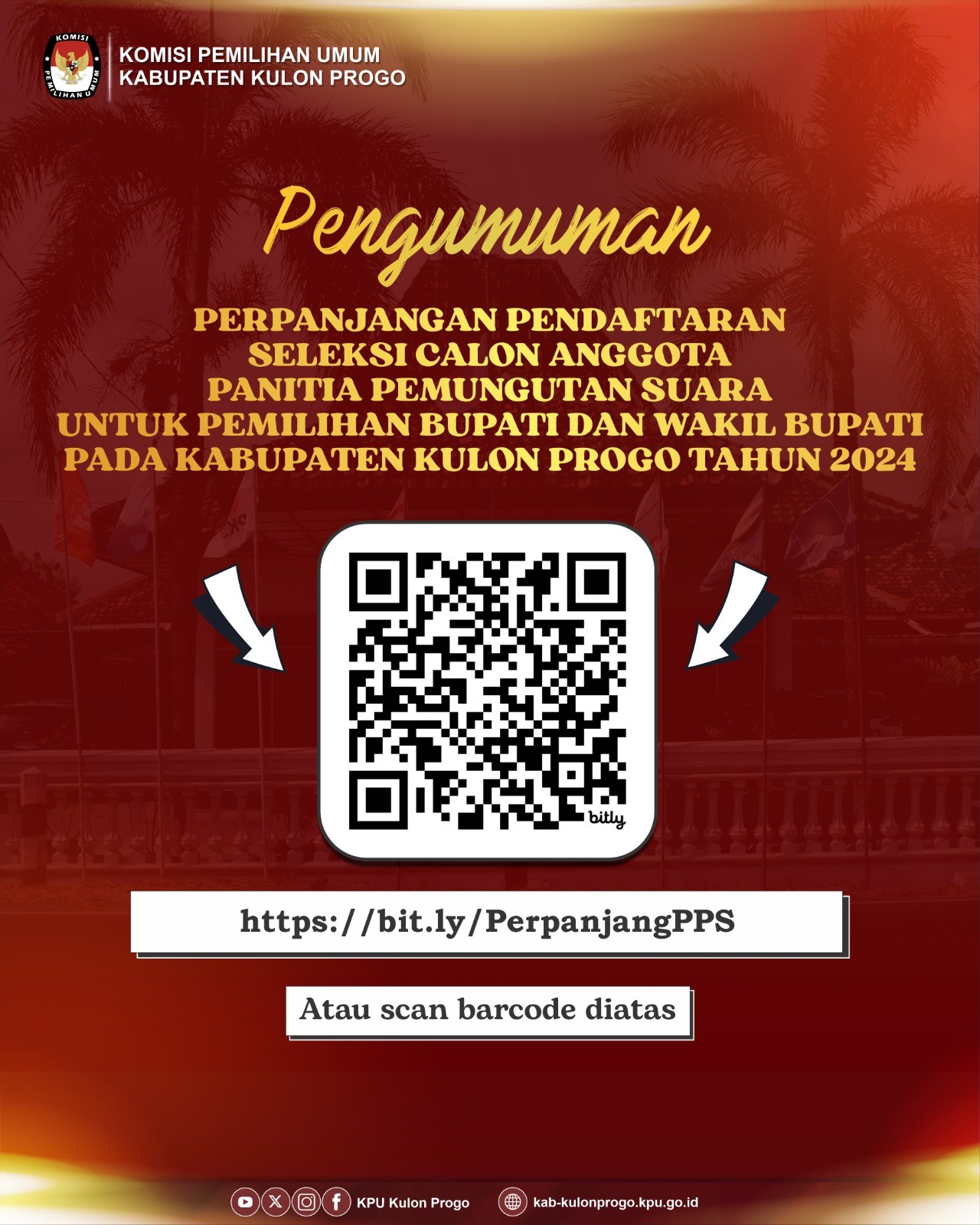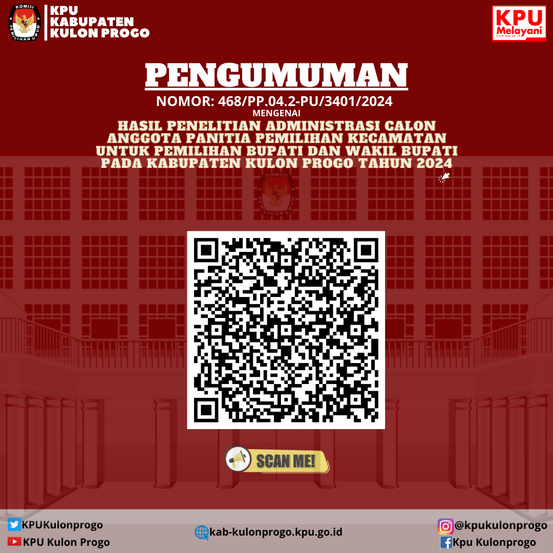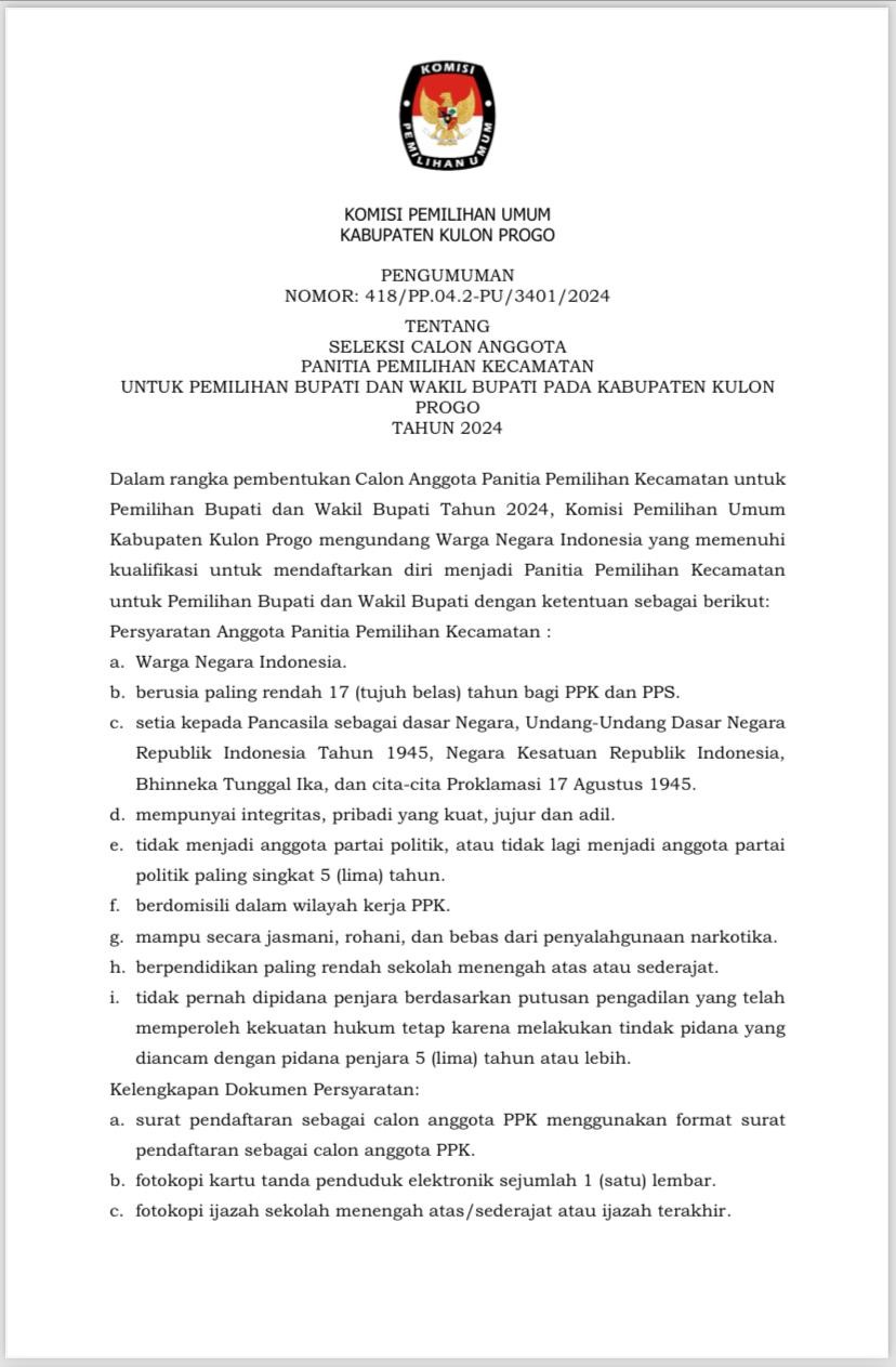 PENGUMUMAN NOMOR : 469/PL.02.2-PU/3401/2/2024 TENTANG PENYERAHAN PERSYARATAN DUKUNGAN CALON PERSEORANGAN PEMILIHAN BUPATI DAN WAKIL BUPATI KABUPATEN KULON PROGO TAHUN 2024